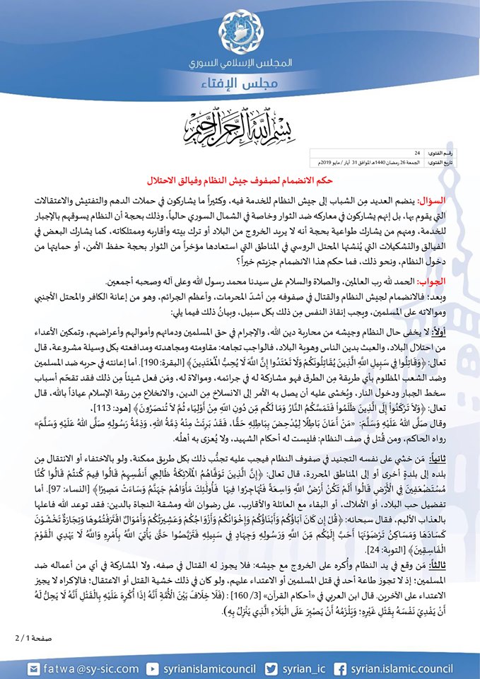 حكم الانضمام لصفوف جيش النظام وفيالق الاحتلال