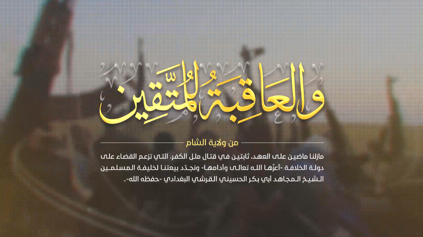 نشر المكتب الإعلامي لما يسمى "ولاية الشام" التابع لتنظيم الدولة إصدارًا مرئيًا بعنوان: (والعاقبة للمتقين)، مؤرّخ بشهر ذي الحجة عام 1440هـ، يبشر فيه المتحدّث: "أبو عبدالله الشامي" بأنّ التنظيم في سوريا ما زال قائمًا من خلال عملياته التي يقوم بها ضد (المرتدين)، وأن الابتلاءات التي أصابتهم لم تزدهم إلا قوّة! ويقينًا بقرب نصر الله! وأنّ الانتصار على التنظيم زائف، والأيام دُوَل!