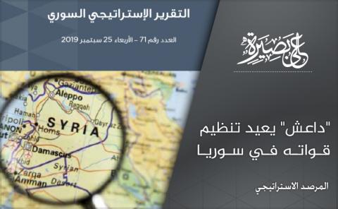 ذكر "المرصد الاستراتيجي" في "التقرير الاستراتيجي السوري"، في العدد رقم (71) الصادر يوم الأربعاء 25-9-2019 صفحة (15): أنّ تنظيم الدولة (داعش) يعيد تنظيم قواته في سوريا.