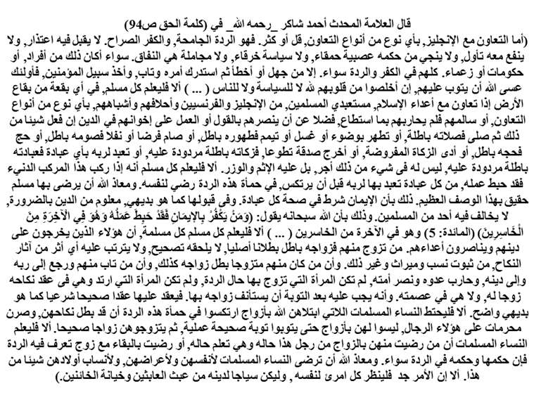 وفي طلبه نشر فتوى الشيخ أحمد شاكر إشارة خطيرة وكبيرة، ففتوى أحمد شاكر بمن انحاز لصف الانكليز وقاتل معهم، أو صار منهم، وحكم عليه بالردة والقتل، فهل يعني هذا أن من وقع على الهدنة، هو مرتد ويجب قتله لأنه انحاز إلى صف النظام ووقع في مظاهرة له؟