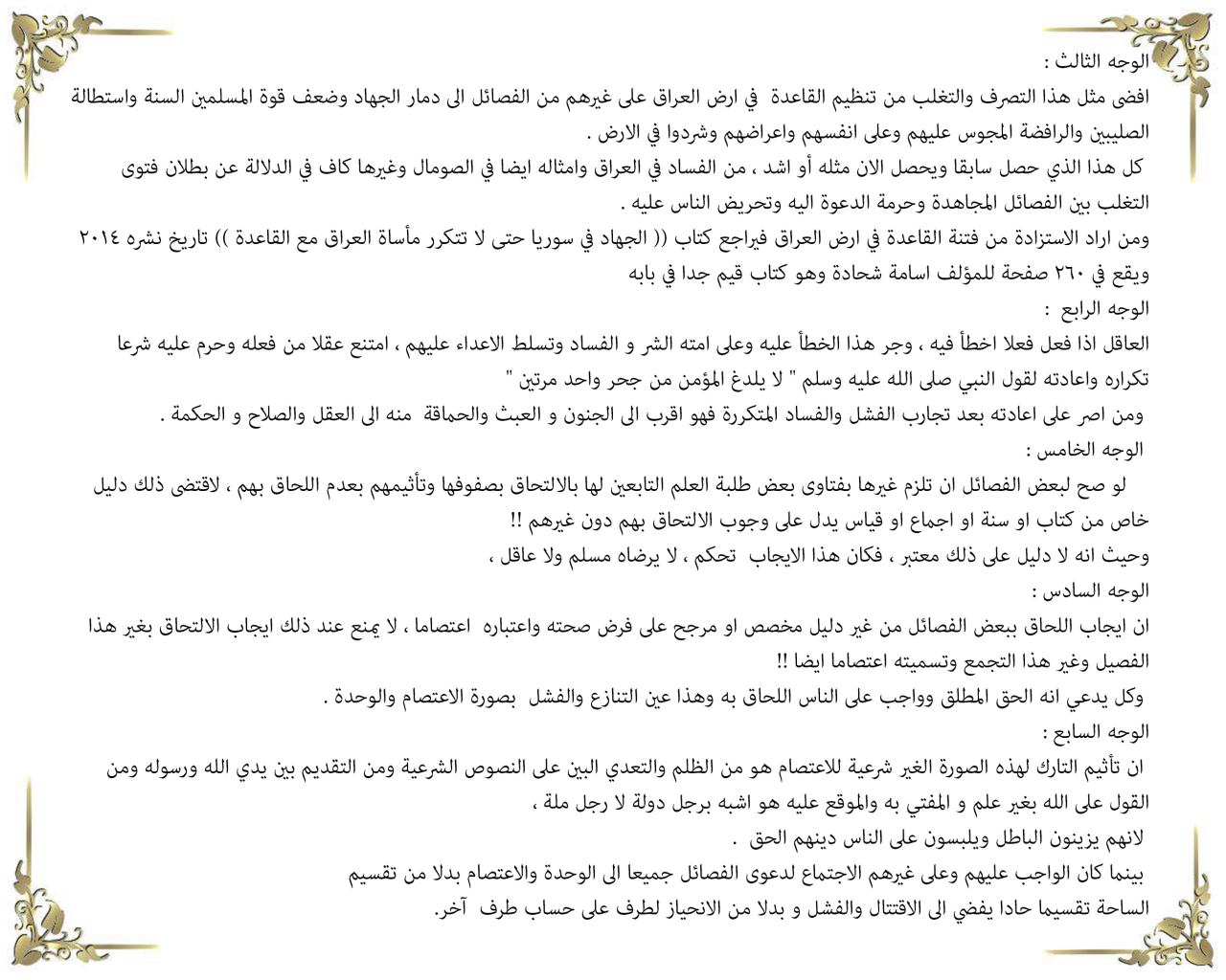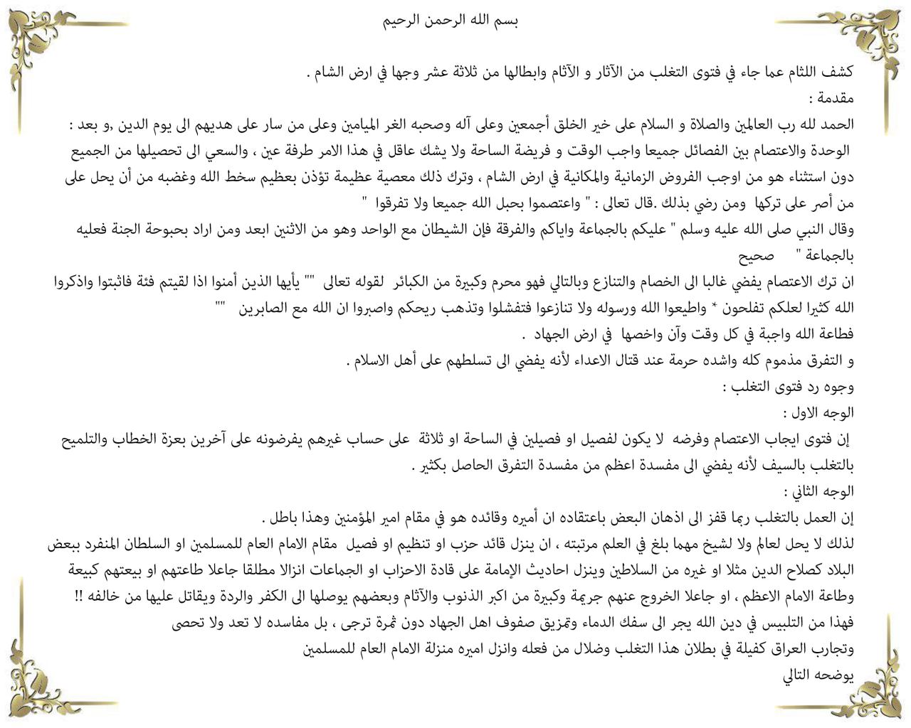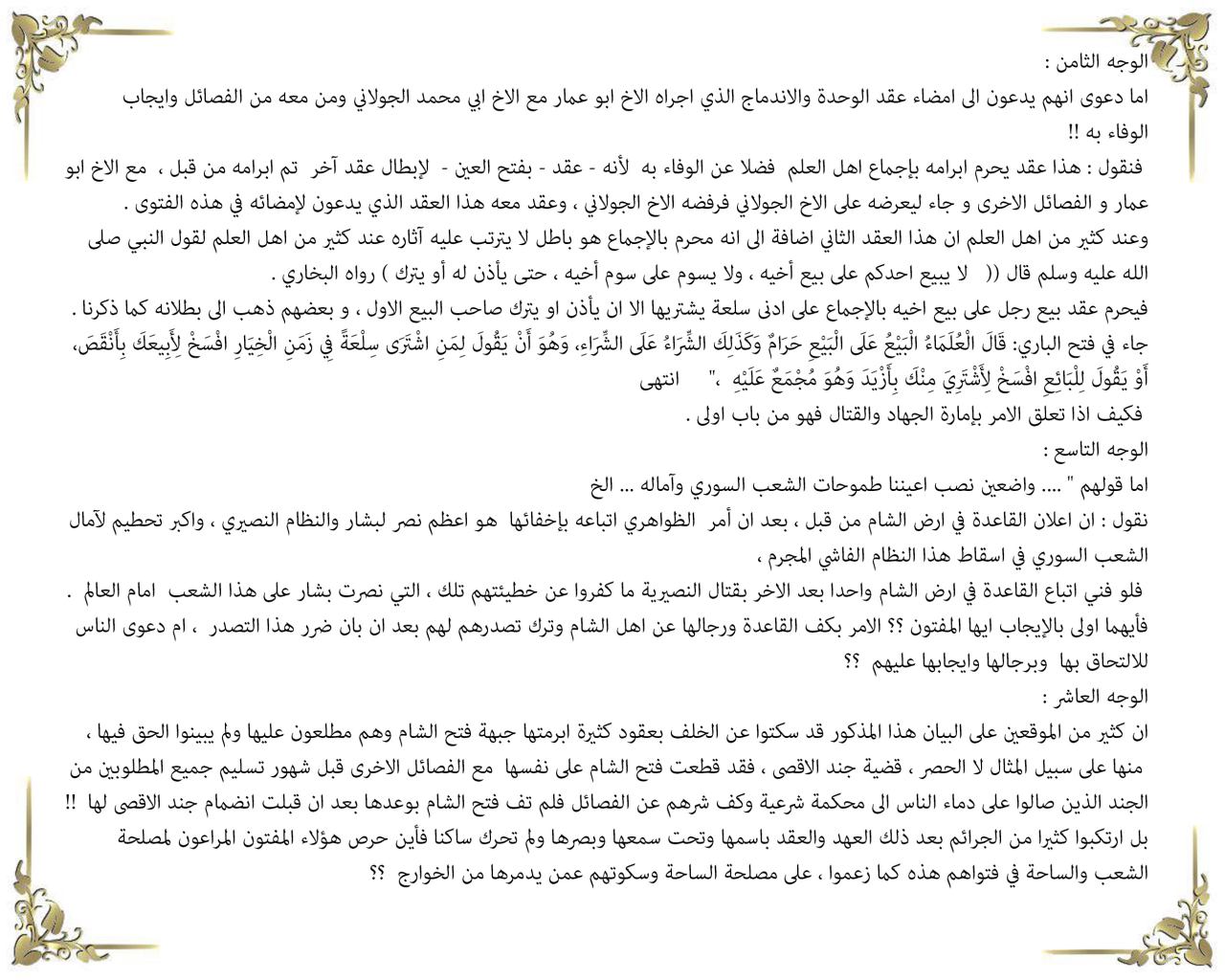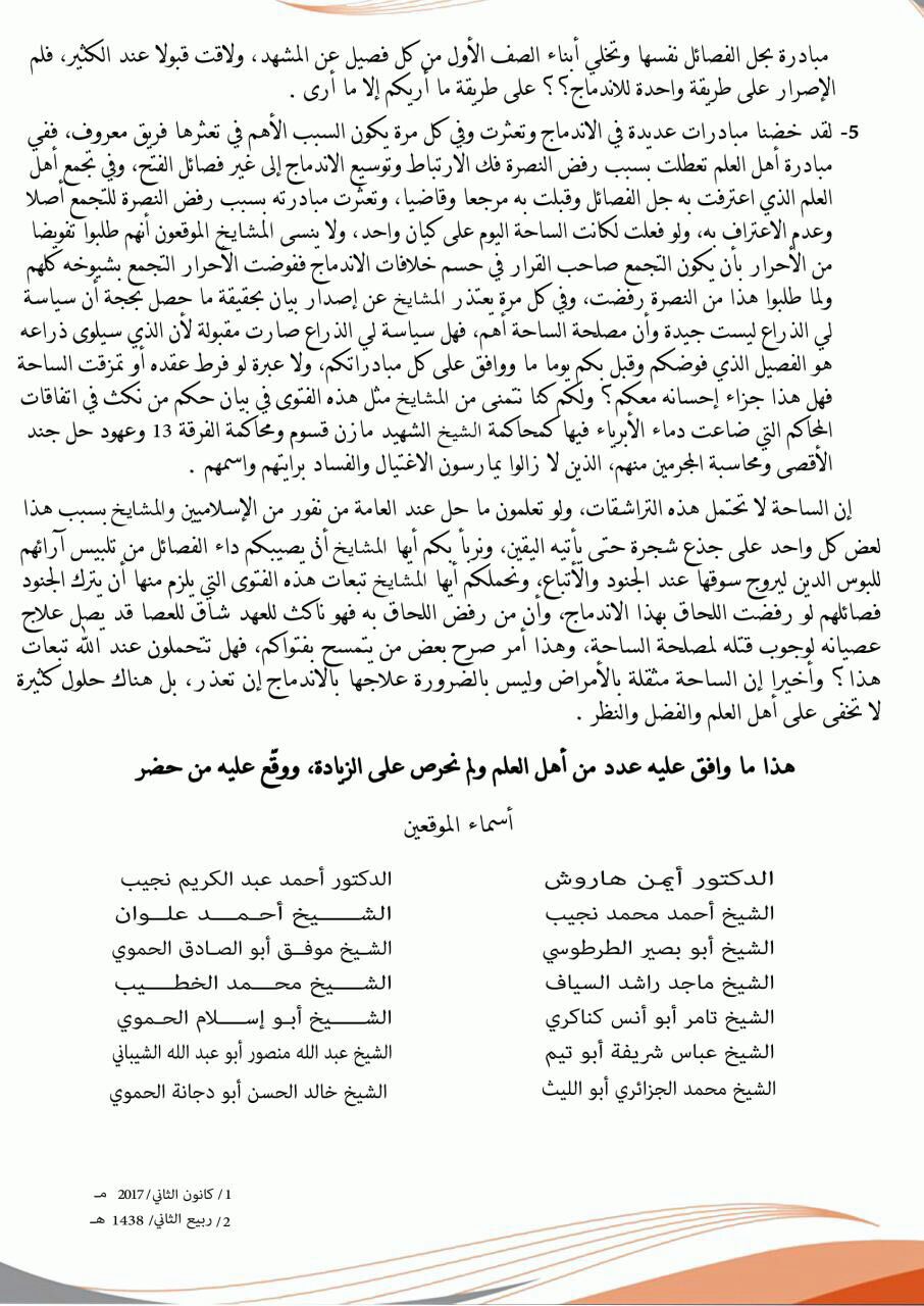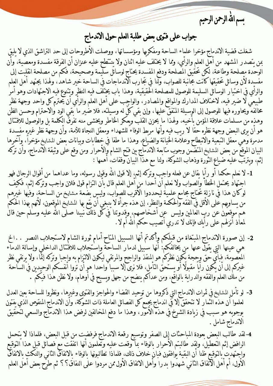 نص فتوى الاندماج التي أصدرها عدد من الشخصيات في سوريا، على رأسهم المحيسني: