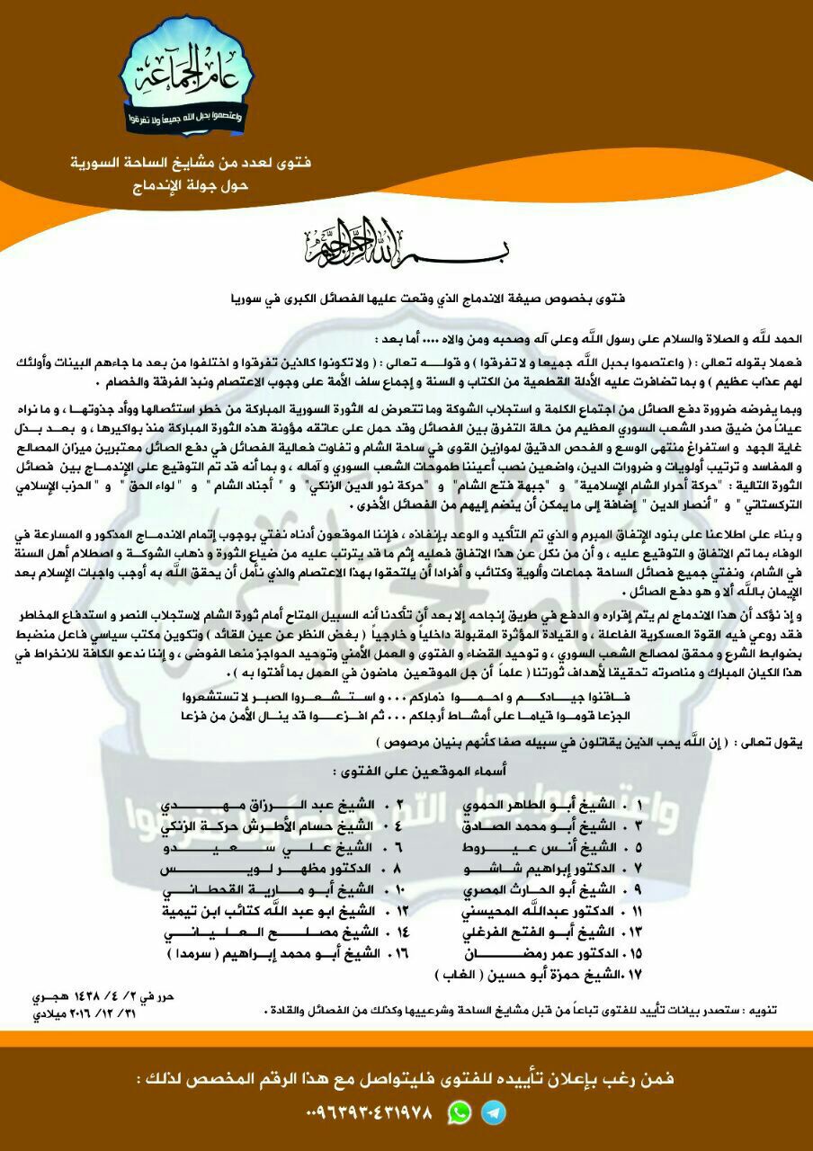 وكان عدد من شرعيّي جيش الأحرار ومركز دعاة الجهاد الذي يرأسه المحيسني وشرعيّي حركة نور الدين الزنكي وغيرهم، أصدروا فتوى قبل عدة أيام أوجبت الإسراع بإنفاذ ماسمته الاتفاق بين عدة فصائل على الاندماج، أبرزها: