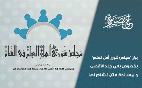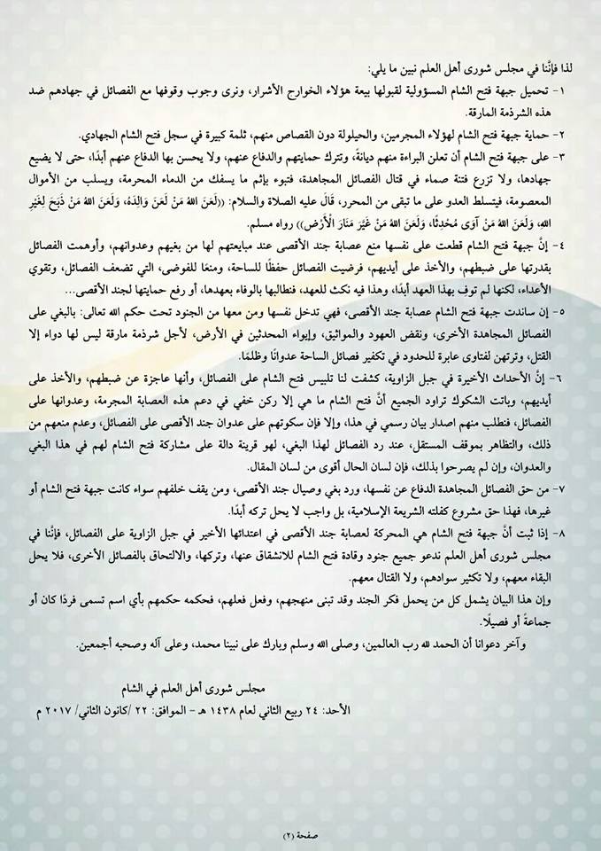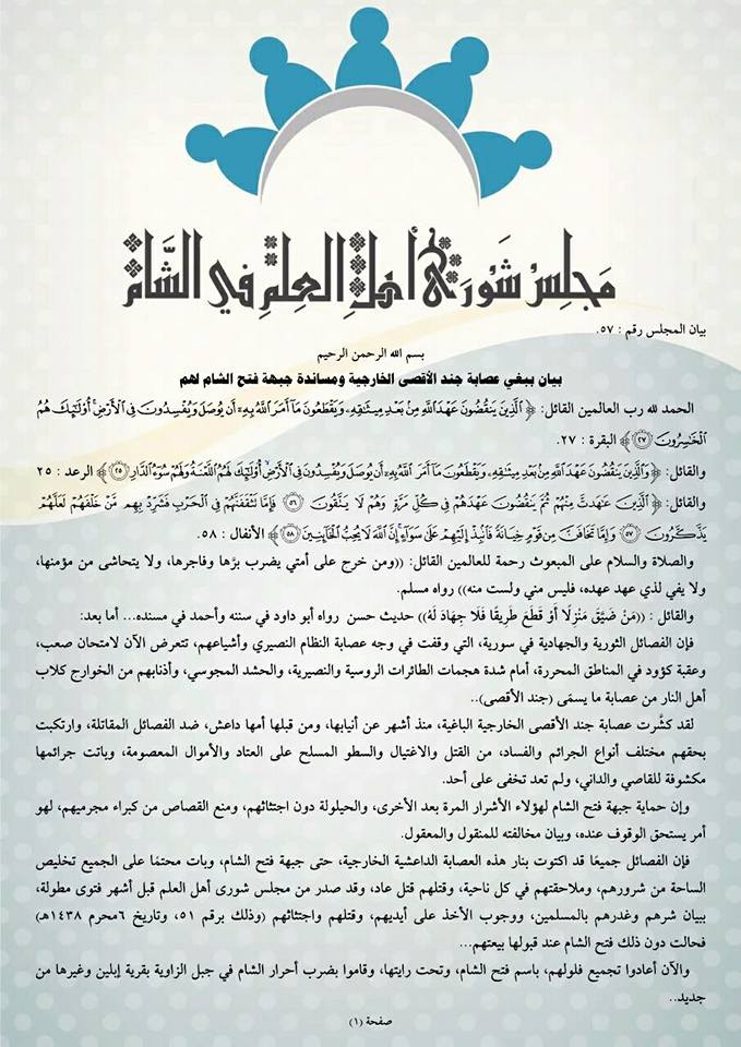 - البيان (1) "مجلس شورى أهل العلم" بخصوص بغي جند الأقصى ومساعدة فتح الشام لها