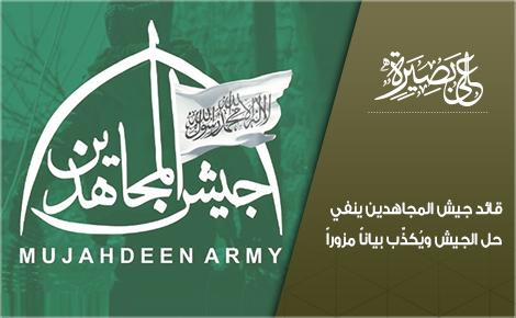 نفى المقدم "أبو بكر" قائد جيش المجاهدين ما تداولته صفحات على الإنترنت بخصوص حل الجيش، مؤكداً أن البيان الذي ذُيّل بتوقعيه مزور ولا صحة لما ورد فيه.