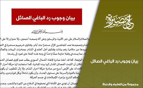 أصدر عدد من العلماء والدعاة بياناً أطلقوا عليه (بيان وجوب رد الباغي الصائل)، وطالب البيان؛ الفصائل -وخاصة فيلق الشام وحركة الزنكي- أن تؤدي حق الأمانة التي تحملوها في الدفاع عن الثورة والشعب، وعدم الاكتفاء بالحياد أو الفصل بين الطرفين.