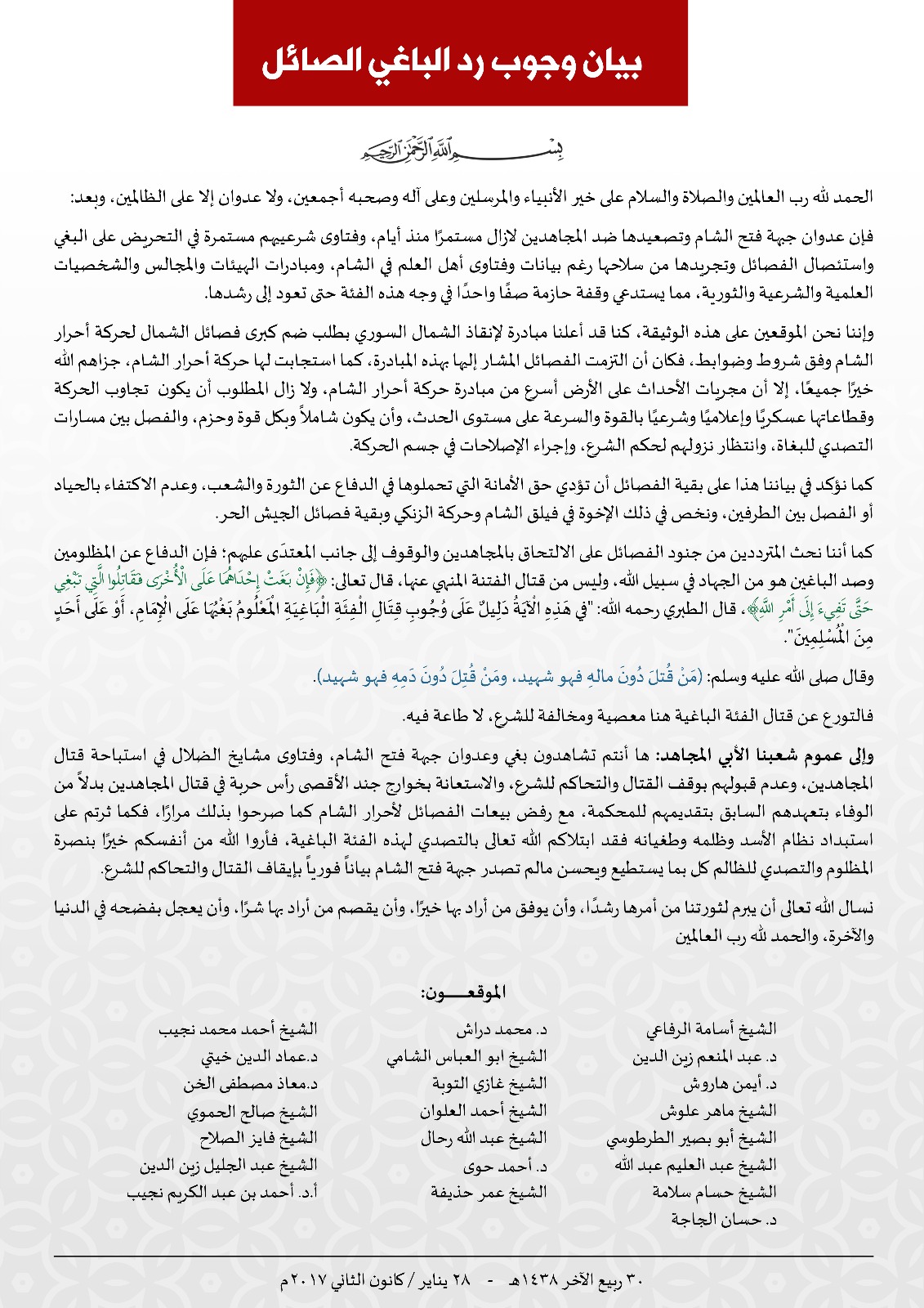 فإن عدوان جبهة فتح الشام وتصعيدها ضد المجاهدين لازال مستمرًا منذ أيام، وفتاوى شرعييهم مستمرة في التحريض على البغي واستئصال الفصائل وتجريدها من سلاحها رغم بيانات وفتاوى أهل العلم في الشام، ومبادرات الهيئات والمجالس والشخصيات العلمية والشرعية والثورية، مما يستدعي وقفة حازمة صفًا واحدًا في وجه هذه الفئة حتى تعود إلى رشدها.