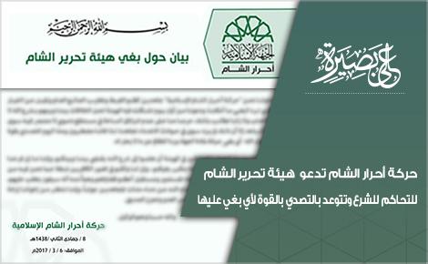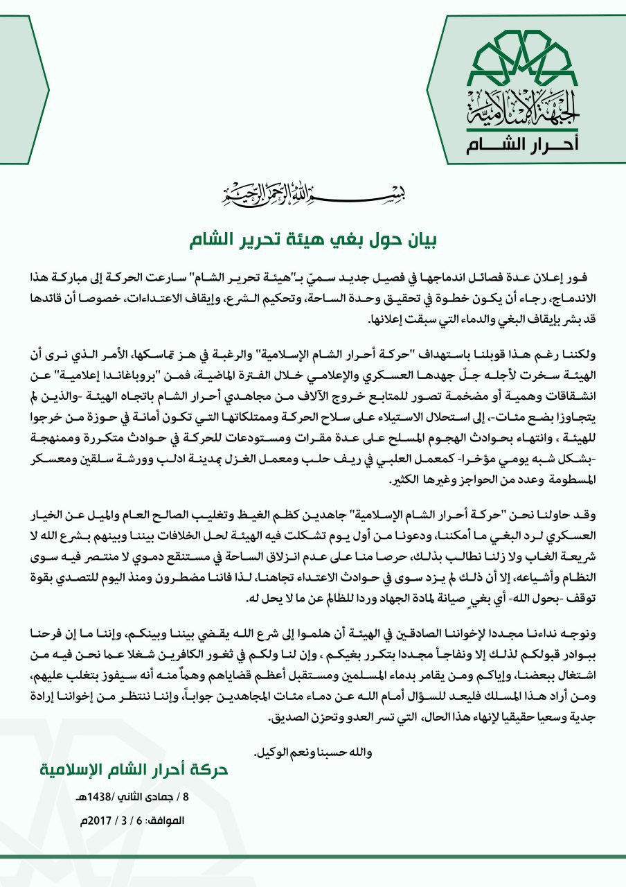 أصدرت حركة أحرار الشام الإسلامية -اليوم الاثنين 6/3/2017- بياناً تحدثت فيه عن بغي هيئة تحرير الشام وتجاوزاتها ضد الفصائل التابعة للحركة.