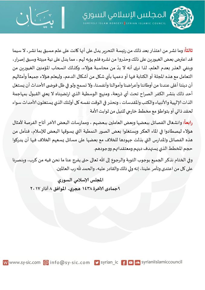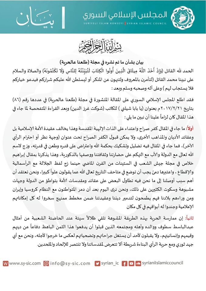 وهذا البيان من المجلس الإسلامي السوري جاء ردًّا على مقال فيه الكثير من التطاول على الله تعالى، واعتداء على مقدّسات المسلمين ومعتقداتهم، وهجوم على حرّياتهم وأفكارهم.