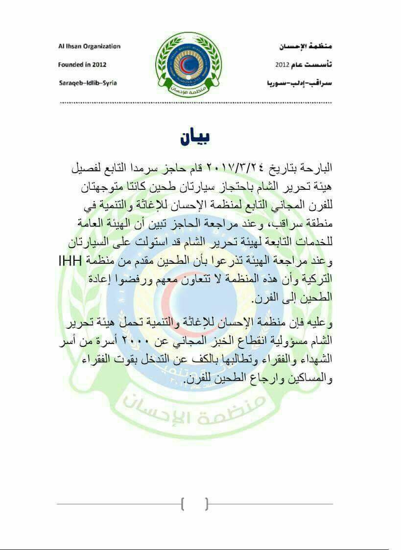 وسبق أن أصدرت منظمة الإحسان للإغاثة والتنمية بياناً قالت فيه إن أحد الحواجز التابعة لهيئة تحرير الشام في مدينة سرمدا احتجز سيارتين تحملان مادة الطحين كانتا متجهتين إلى الفرن المجاني التابع للمنظمة في منطقة سراقب بريف إدلب. وقالت المنظمة قد تبين أن الأمر قد صدر عن "الهيئة العامة للخدمات التابعة لهيئة تحريرالشام" التي رفضت إعادة الطحين بعد مراجعتها، بذريعة أن الطحين مقدم من منظمة "IHH" التركية، التي رفضت التعاون معهم. وختمت المنظمة بيانها بتحميل هيئة تحرير الشام مسؤولية انقطاع مادة الخبز المجاني عن 2,000 عائلة من عوائل الشهداء والفقراء، وطالبتهم بالكف عن التدخل بقوت الفقراء والمساكين، وإعادة الطحين للفرن.