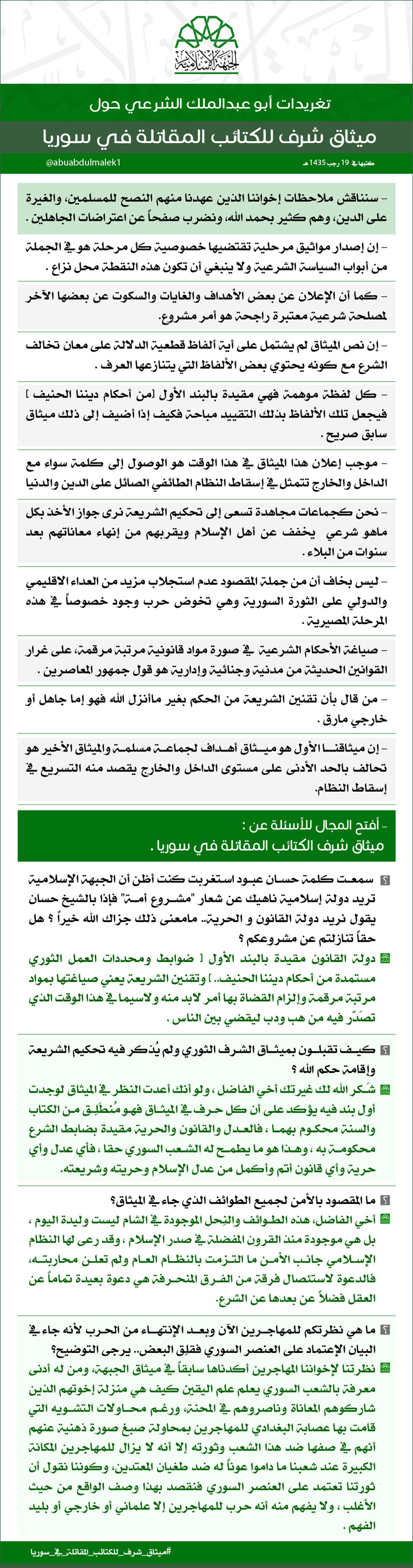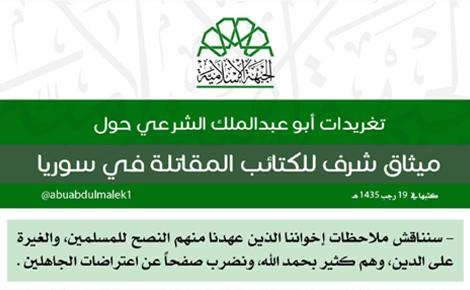 تغريدات أبوعبدالملك الشرعي حول ميثاق شرف الكتائب المقاتلة في سوريا