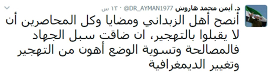 د. أيمن هاروش أصدر بياناً حول هذه النازلة، ناشد فيه، أهالي بلدتي الزبداني ومضايا رفض الاتفاق، وفضل لهم المصالحة مع النظام والبقاء في مدنهم على أطراف دمشق على القبول بالتهجير القسري والتغيير الديمغرافي حول عاصمة الأمويين دمشق، مبيناً أهم أسباب اجتهاده في البيان التالي: