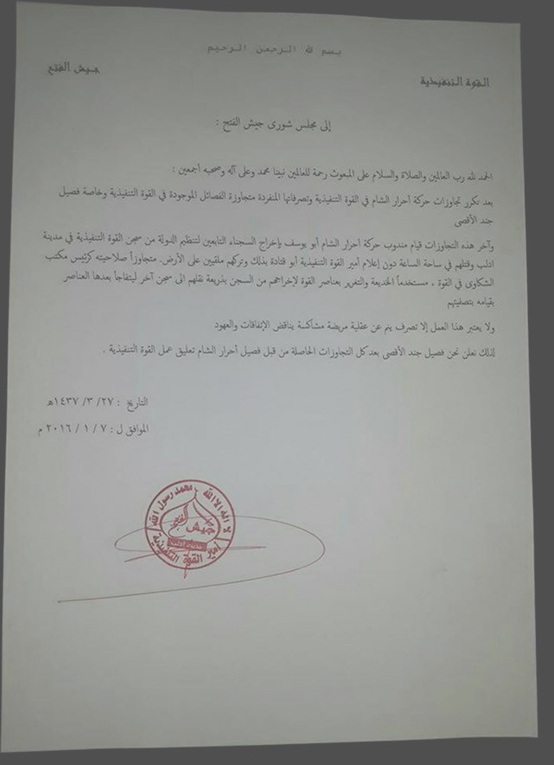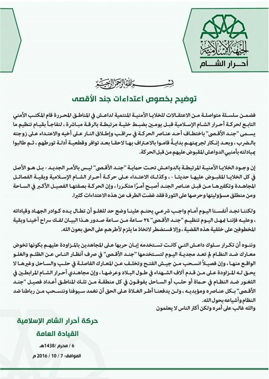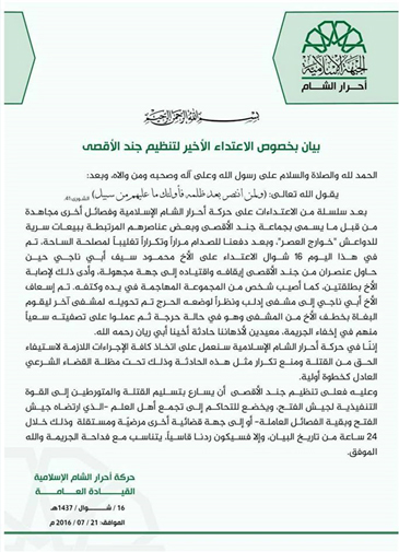 بتاريخ 21 يوليو/تموز 2016 أصدرت حركة أحرار الشام الإسلامية بياناً رسمياً اتهمت فيه مجموعة من تنظيم جند الأقصى بتصفية أحد عناصرها بعد اقتحام مشفى مدينة أريحا وإخراجه مصاباً.