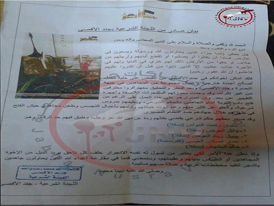 وذكرت الحركة في بيانها، أن "ما يُسمَّى جماعة جند الأقصى" قاموا بتكرار اعتداءاتهم عليها وعلى فصائل أخرى، متهمة إياهم بالبيعة السرية لمن وصفتهم بـ "خوارج العصر"، في إشارة إلى تنظيم الدولة.