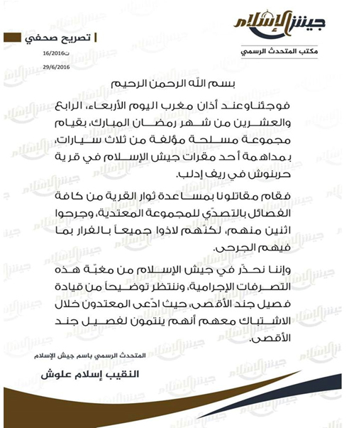 بتاريخ 29 يونيو/ حزيران 2016 أعلن جيش الإسلام في بيان رسمي صادر عنه تعرُّض أحد مقراته في قرية "حربنوش" بمحافظة إدلب إلى هجوم مسلح من مجموعة تستقل ثلاث سيارات.