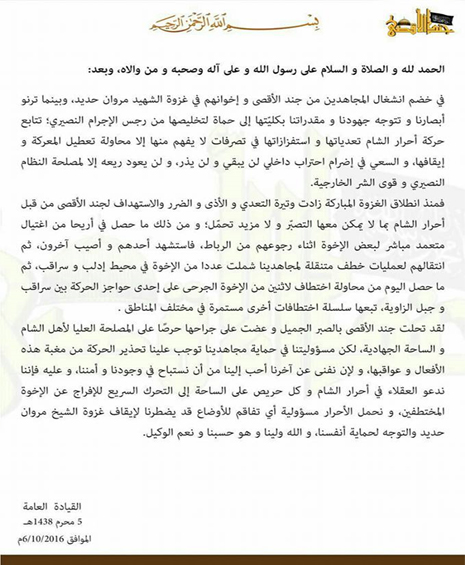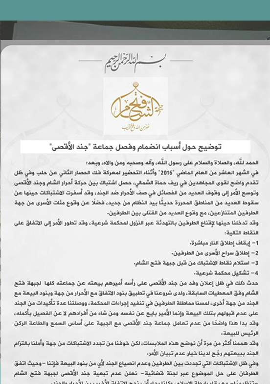 وزادت تلك النداءات والانتقادات لفتح الشام، عندما هاجمت جماعة من جند الأقصى فجر يوم الجمعة 20 يناير/ كانون الثاني 2017 مقرات تتبع لحركة أحرار الشام، في بلدة البارة، وإبلين في جبل الزاوية في ريف إدلب الغربي، وقامت باعتقال عدد من عناصر الحركة دون أي اشتباك، بينهم أحد الأمنيين ويدعى "أبو حفص إبلين"، مما دفع فتح الشام -عبر بيان صادر عنها- إلى إعلان عدم تبعية جند الأقصى لها، حيث أكدت في بيانها أنه وبسبب عدم "انصياع جند الأقصى لبنود البيعة" وبسبب "تجدد الاشتباكات بينها وبين الفصائل"، تعتبر جماعة الجند غير تابعة كتنظيم لفتح الشام مع التأكيد على بقاء "رابطة الإسلام"!