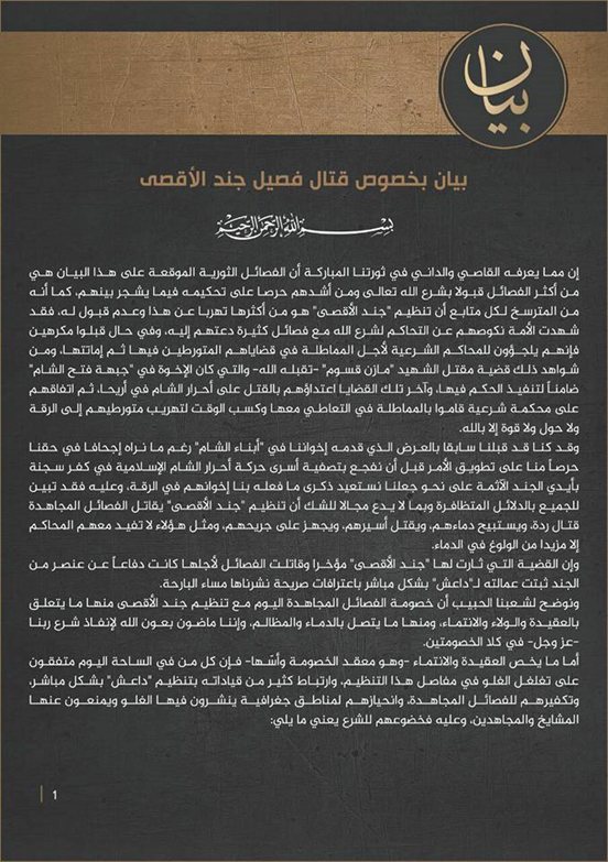 وذكر البيان في مضمونه أن سبب الانشقاق من التنظيم والانضمام إلى جبهة النصرة هو "استجابة لأمر الله تعالى بالاعتصام وتوحيد الصف، وطاعة لعلماء الأمة وعلماء الجهاد وتقوية صف المجاهدين".