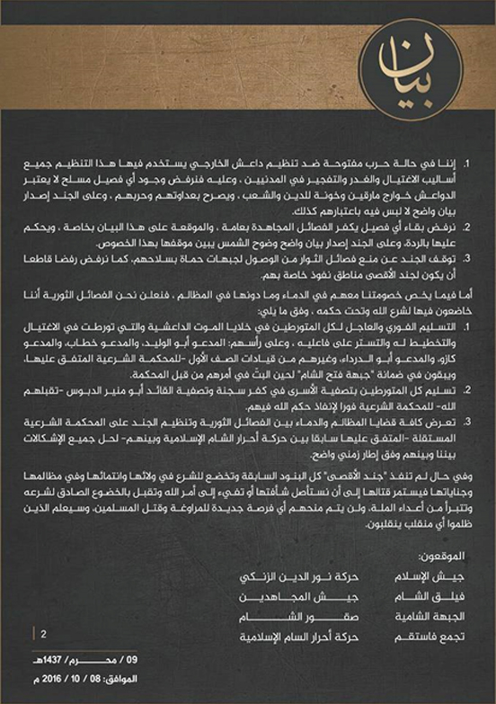 وكان من أبرز الفصائل الموقِّعة على البيان (جيش الإسلام، وصقور الشام، وفيلق الشام، وحركة نور الدين الزنكي، والجبهة الشامية، وجيش المجاهدين، وغرفة عمليات فتح حلب، وتجمع فاستقم كما أمرت.. وغيرها).