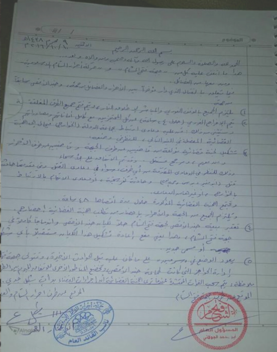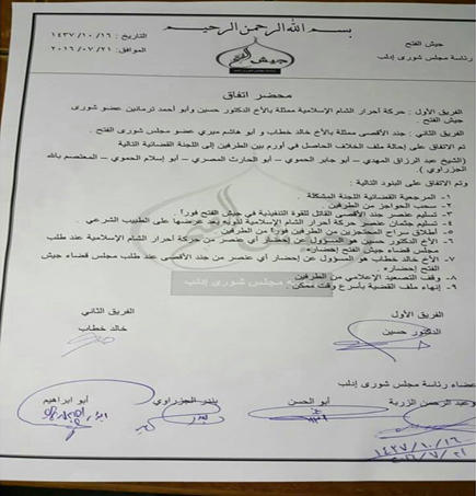 ونص الاتفاق على جعل اللجنة القضائية هي المرجعية، وسحب الحواجز من الطرفين، وتسليم عنصر جند اﻷقصى القاتل للقوة التنفيذية في جيش الفتح فورًا، وتسليم جثمان عنصر حركة أحرار الشام إلى ذويه بعد عرضه على طبيب شرعي.