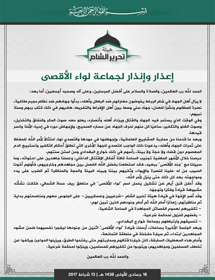 وكان البيان مُعنوناً باسم "إعذار وإنذار لجماعة لواء الأقصى"، أكدت فيه "هيئة تحرير الشام" أن استمرار الجماعة في تكفير الفصائل، ورفضهم النزول لمحكمة شرعية، والتنسيق والارتباط بتنظيم الدولة، دفع الهيئةَ للبدء بقتالهم حتى يبادروا بفتح الطرقات ورفع الحواجز، والتوقف عن عمليات الخطف وتكفير المسلمين.