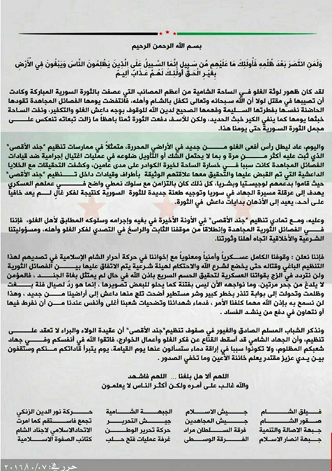 وجاء في البيان أن المجاهدين ومن بينهم جبهة النصرة "بتنسيق واتفاق على السعي لإراحة البلاد والعباد من المفسدين من أي فصيل كانوا ورفع أذاهم عن المسلمين"، وأضاف: أن النصرة لن تتهاون بعد الآن "مع من يتسلط على رقاب المسلمين المستضعفين وثروات البلاد، الذين لن يجدوا منها إلا القوة والحزم في تطبيق الحق والحزم".
