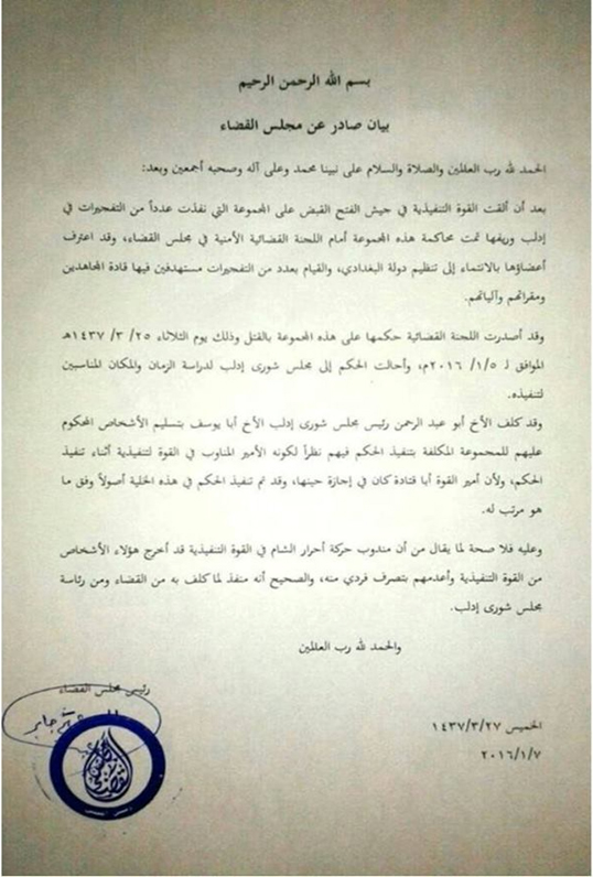 إلّا أن المجلس القضائي في جيش الفتح ردَّ على ادعاءات جند الأقصى، وأصدر بيانًا أكد فيه أن عملية الحكم بإعدام الخلية صدرت عن اللجنة القضائية، وتم إحالته إلى رئيس مجلس شورى إدلب، الذي كلَّف بدوره الأمير المناوب في القوة التنفيذية -ممثل أحرار الشام- بتحديد الزمان والمكان المناسبين، وتنفيذ حكم الإعدام بالخلية، باعتبار أن أمير القوة الأساسي المدعو "أبو قتادة"، وهو من جند الأقصى كان في إجازة، ونفى المجلس القضائي في بيانه أن يكون مندوب أحرار الشام قام بإعدام الخلية بتصرف فردي.