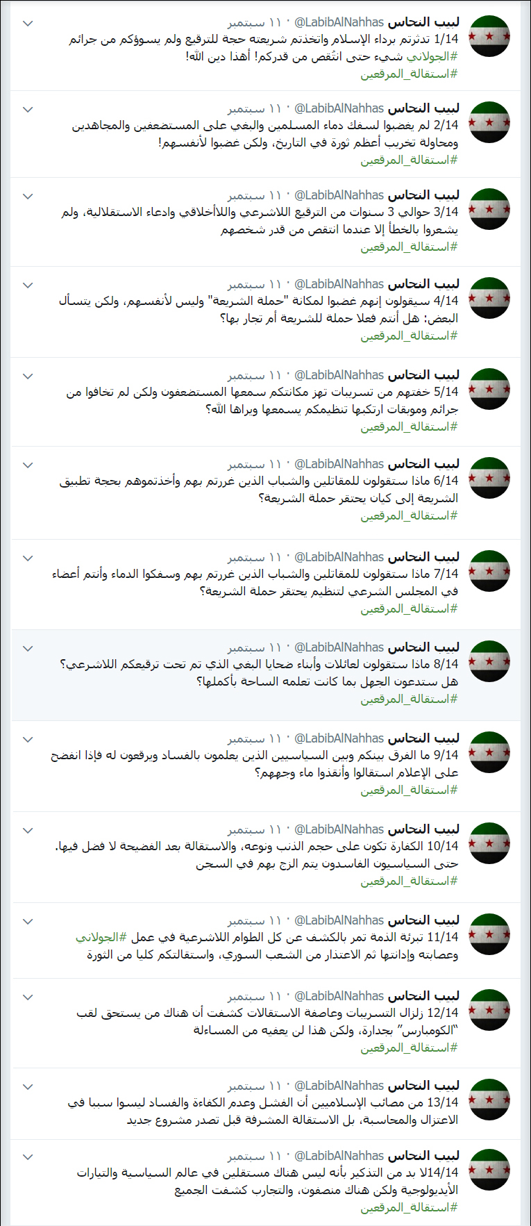 وأضاف (نحاس): "الكفارة تكون على حجم الذنب ونوعه، والاستقالة بعد الفضيحة لا فضل فيها ... تبرئة الذمة تمر بالكشف عن كل الطوام اللاشرعية في عمل الجولاني وعصابته وإدانتها ثم الاعتذار من الشعب السوري، واستقالتكم كليا من الثورة".