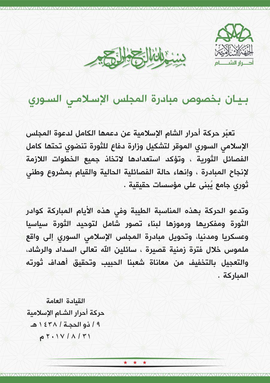 حيث عبّرت حركة أحرار الشام الإسلامية في بيانٍ لها عن دعمها الكامل لمبادرة المجلس وأكدت استعدادها لاتخاذ جميع الخطوات اللازمة لإنجاح المبادرة وإنهاء حالة الفصائلية، والقيام بمشروع وطني ثوري جامع يُبنى على مؤسسات حقيقية.