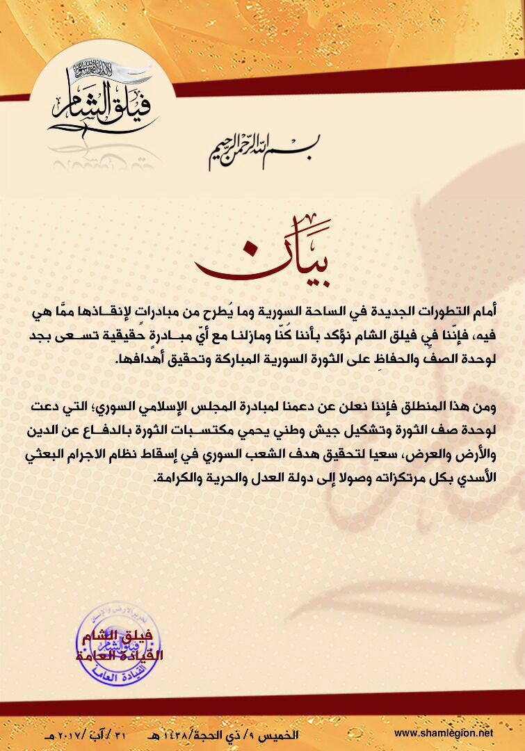 وأعلن فيلق الشام عن دعمه لمبادرة المجلس الإسلامي في بيان له، وقال إنه يقف مع أيّ مبادرة حقيقية تسعى بِجِد لوحدة الصف والحفاظ على الثورة السورية وتحقيق أهدافها.