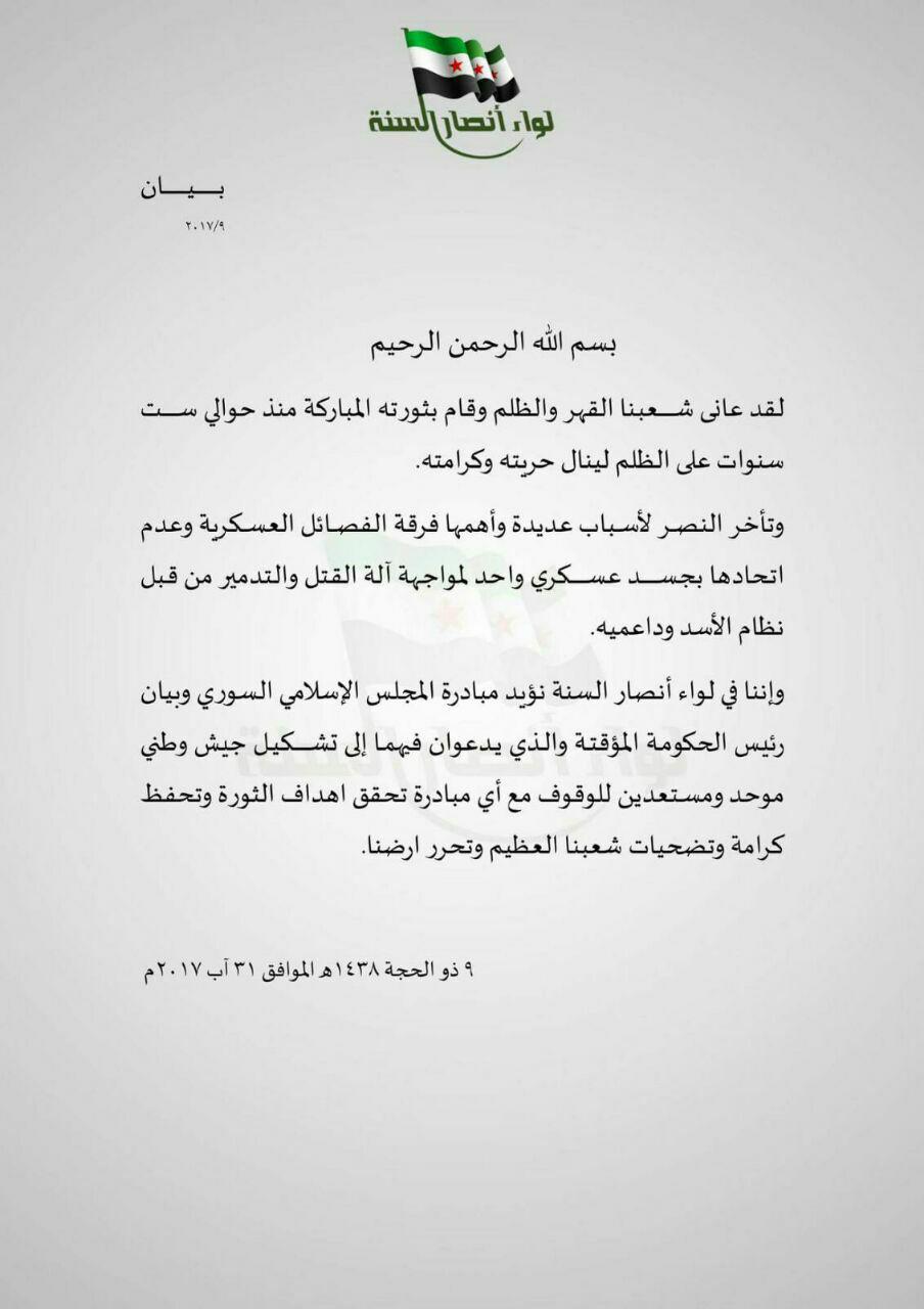 وكان المجلس الإسلامي السوري –الذي يُعد مرجعًا دينيًا مهمًا للسوريين، ولعموم المسلمين فيما يخص القضايا الكبرى والنوازل المتعلقة بما تمرّ بها الأمة الإسلامية في العصر الحاضر، ويضم معظم المدارس الدينية في سورية- قد دعا في مبادرته إلى إنهاء حالة التشرذم وتوحيد الصف دفاعًا عن الدين والعرض والأرض، وإنشاء جيش وطني موحّد تابع لوزارة دفاع بإشراف الحكومة السورية المؤقتة تنضوي فيه جميع الفصائل تحت قيادة واحدة.