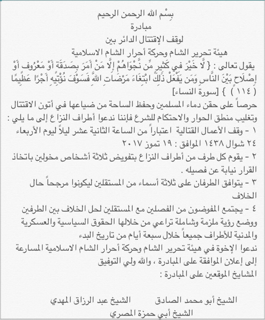 مبادرة تدعو الطرفين إلى وقف الاقتتال وتشكيل لجنة مشتركة من ستة أعضاء مناصفة والاتفاق على تسمية ثلاثة آخرين مستقلين، وسرعان ما وافقت (أحرار الشام) على المبادرة مع الاحتفاظ بحق التصدي لأي هجوم تشنه عليها الهيئة.