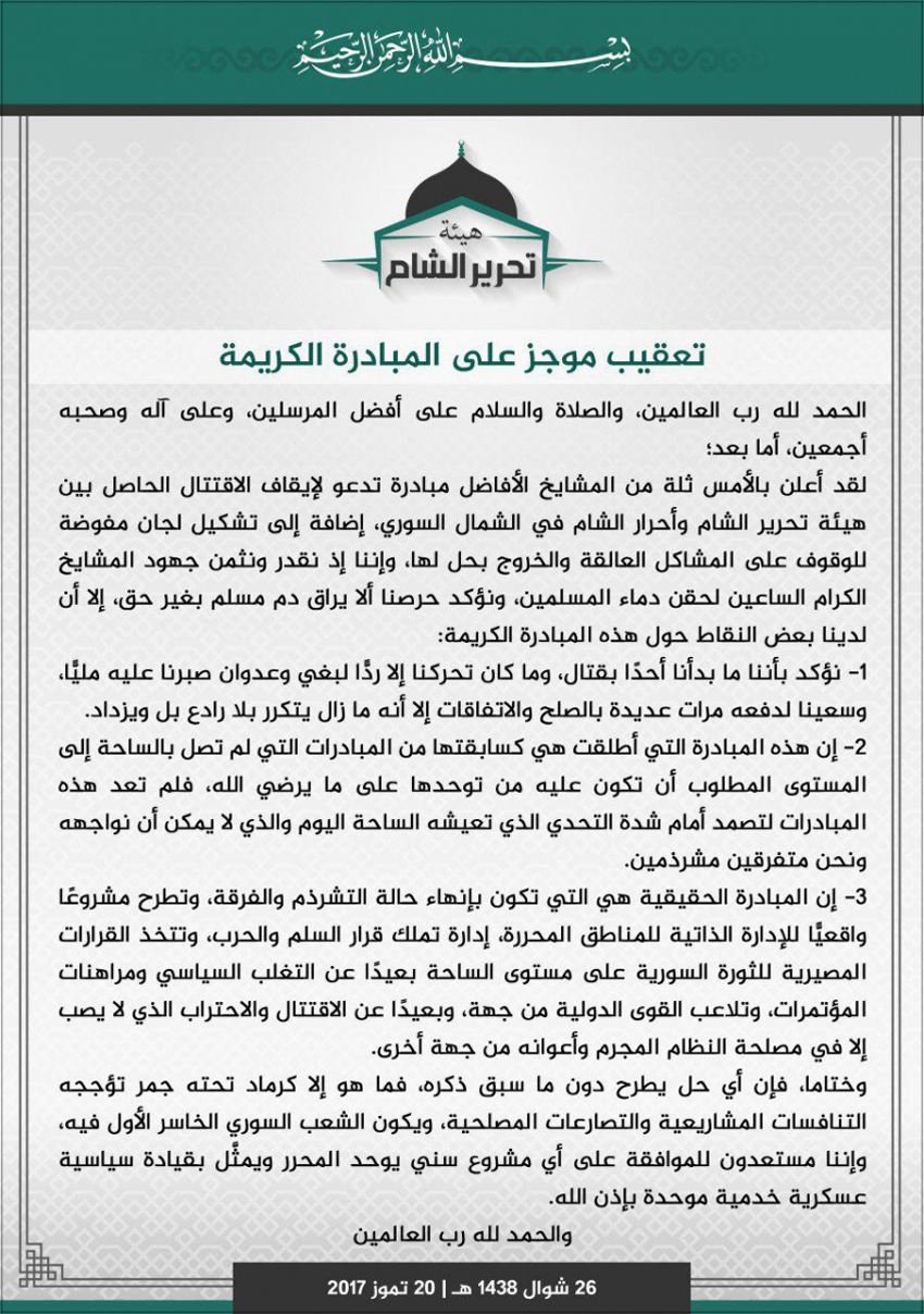 إلا أن (هيئة تحرير الشام) قابلت مبادرة وقف القتال بالرفض، وجاء في بيان صدر عنها ونشر على مواقع التواصل الاجتماعي الخميس 20-7-2017 أن المبادرة المطروحة "هي كسابقاتها وليست بالمستوى المطلوب ولن تصمد، وبأنها تقوم برد بغي حاصل عليها، وأن المبادرة الحقيقة هي التي تطرح مشروعا لإدارة ذاتية للمناطق المحررةرفض (تنظيم القاعدة) الكثير من المبادرات التي كانت تدعو إلى وقف الاقتتال والتحاكم إلى محاكم شرعية، لأن قتال الفصائل الثورية واستئصالها جزء من مشروعه في سورية، إضافة إلى أنه يرى أن المحاكم التابعة للثوار غير شرعية ولا يجوز التحاكم إليها، ولا بد من خضوع الجميع إلى محاكمهم التي تحكم باسم القاعدة وشرعها.".