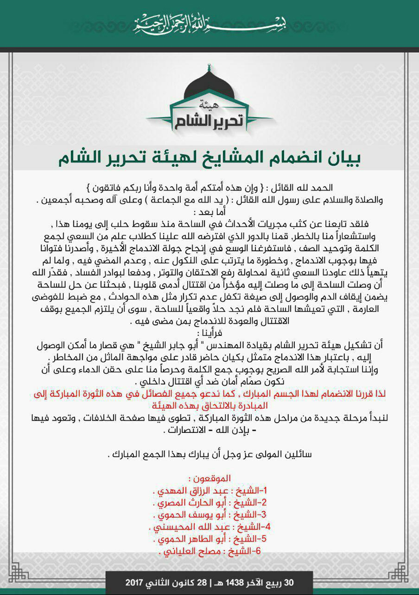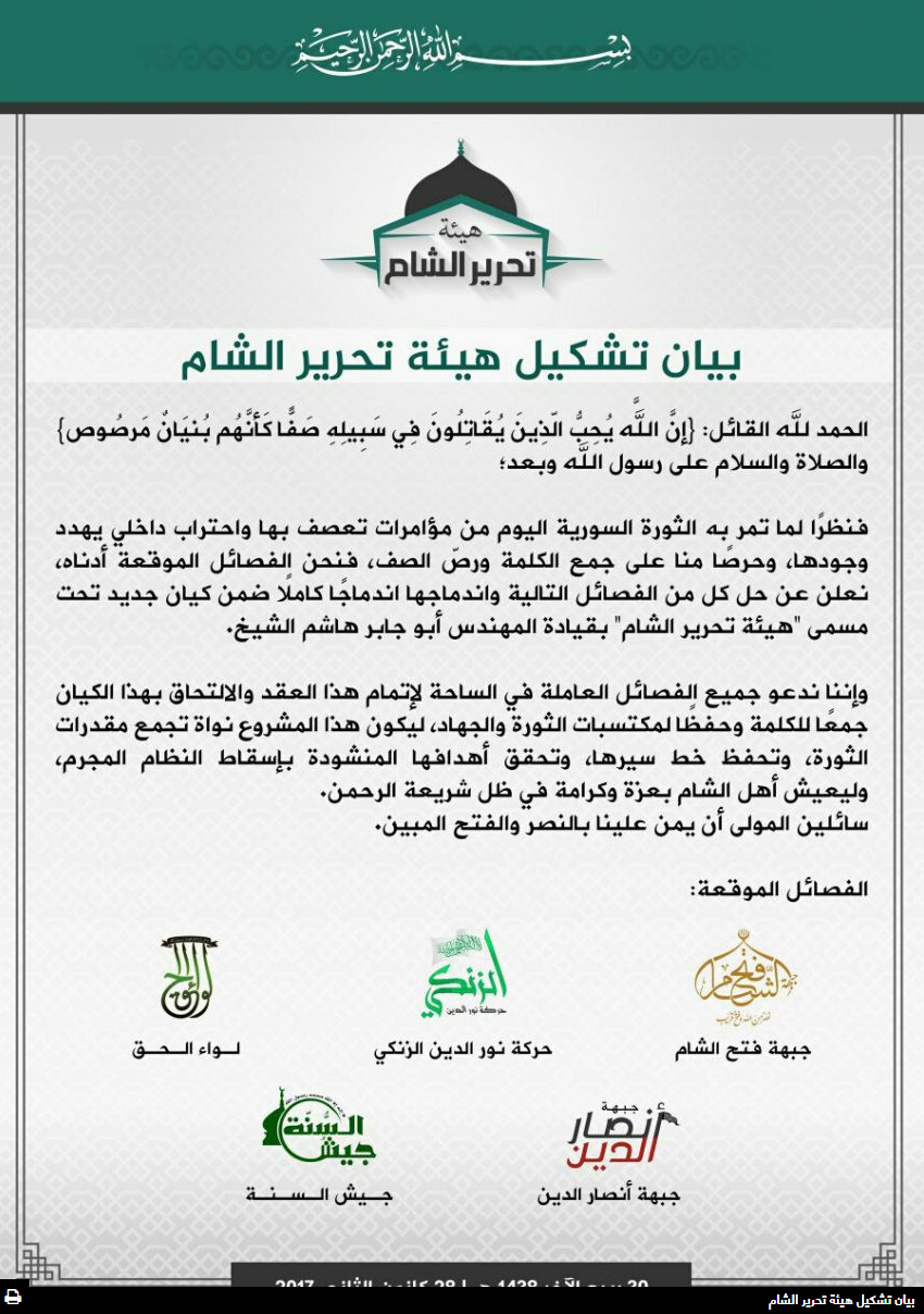 في 28 كانون الثاني 2017 أُعلن عن تشكيل (هيئة تحرير الشام) من قبل خمسة فصائل رئيسية في سورية، هي: (جبهة فتح الشام -جبهة النصرة سابقًا) و (حركة نور الدين زنكي) و (لواء الحق) و (جبهة أنصار الدين) و(جيش السنة)