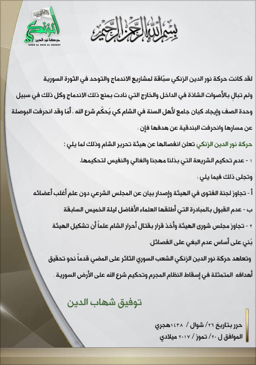 بعد ذلك أصدرت (حركة نور الدين الزنكي) الخميس 20-7-2017 بيانا أعلنت فيه انفصالها عن (هيئة تحرير الشام)، وأرجعت السبب إلى عدم تحكيم (هيئة تحرير الشام) الشريعة، وتجاوز لجنة الفتوى في (تحرير الشام) بإصدار بيان عن المجلس الشرعي دون علم أغلب أعضائه، إضافة إلى بغي الهيئة على (أحرار الشام)، ورفضها المبادرة التي أطلقها العلماء لوقف القتال.