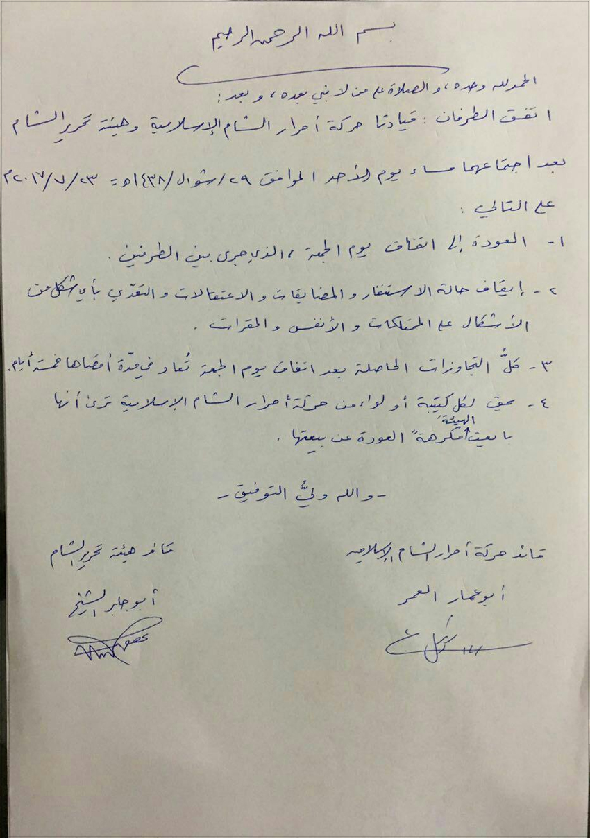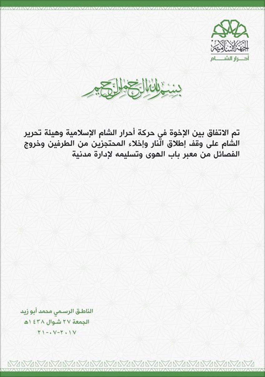 بعد هذا الخلاف الكبير الذي استمر لأيام بين (حركة أحرار الشام) و(هيئة تحرير الشام) في إدلب، وأدى إلى سقوط قتلى وجرحى بين الطرفين، واعتقالات طالت العديد من عناصر الطرفين انتهى بتوقيع اتفاق مساء يوم الجمعة 21-7-2017 يقضي بوقف إطلاق النار وإطلاق سراح المحتجزين من الطرفين وخروج الفصائل من معبر (باب الهوى) وتسليمه إلى إدارة مدنية.