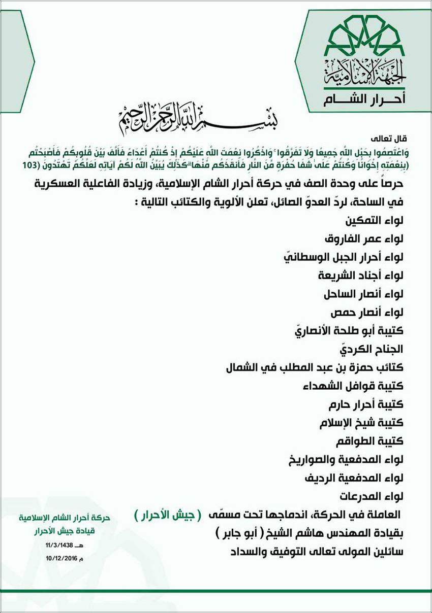 وانضمت إليها لاحقًا عدّة تشكيلات عسكريةمثل: (مجاهدو أشداء -كتيبة الرشيد -كتائب الصحابة -كتيبة قوافل الشهداء -كتيبة أسود الحرب).وشخصيات شرعية تُحسب على تيار (القاعدة) الذي يُعرف بـ(الفكر الجهادي)، مثل: (عبد الرزاق المهدي) و(أبي الحارث المصري) و(أبي يوسف الحموي) و(عبد الله المحيسني) و(أبي الطاهر الحموي) و(مصلح العليّاني).