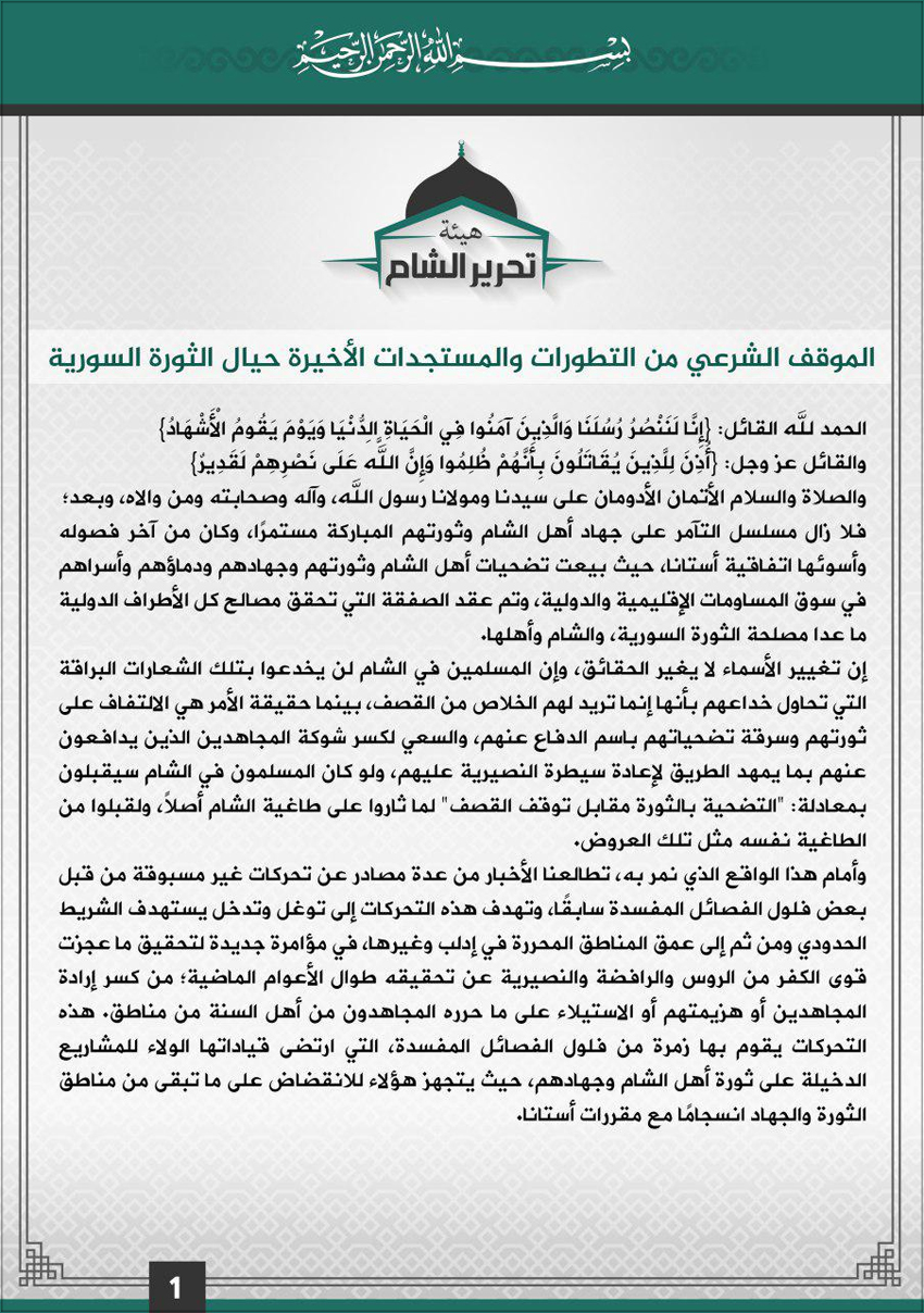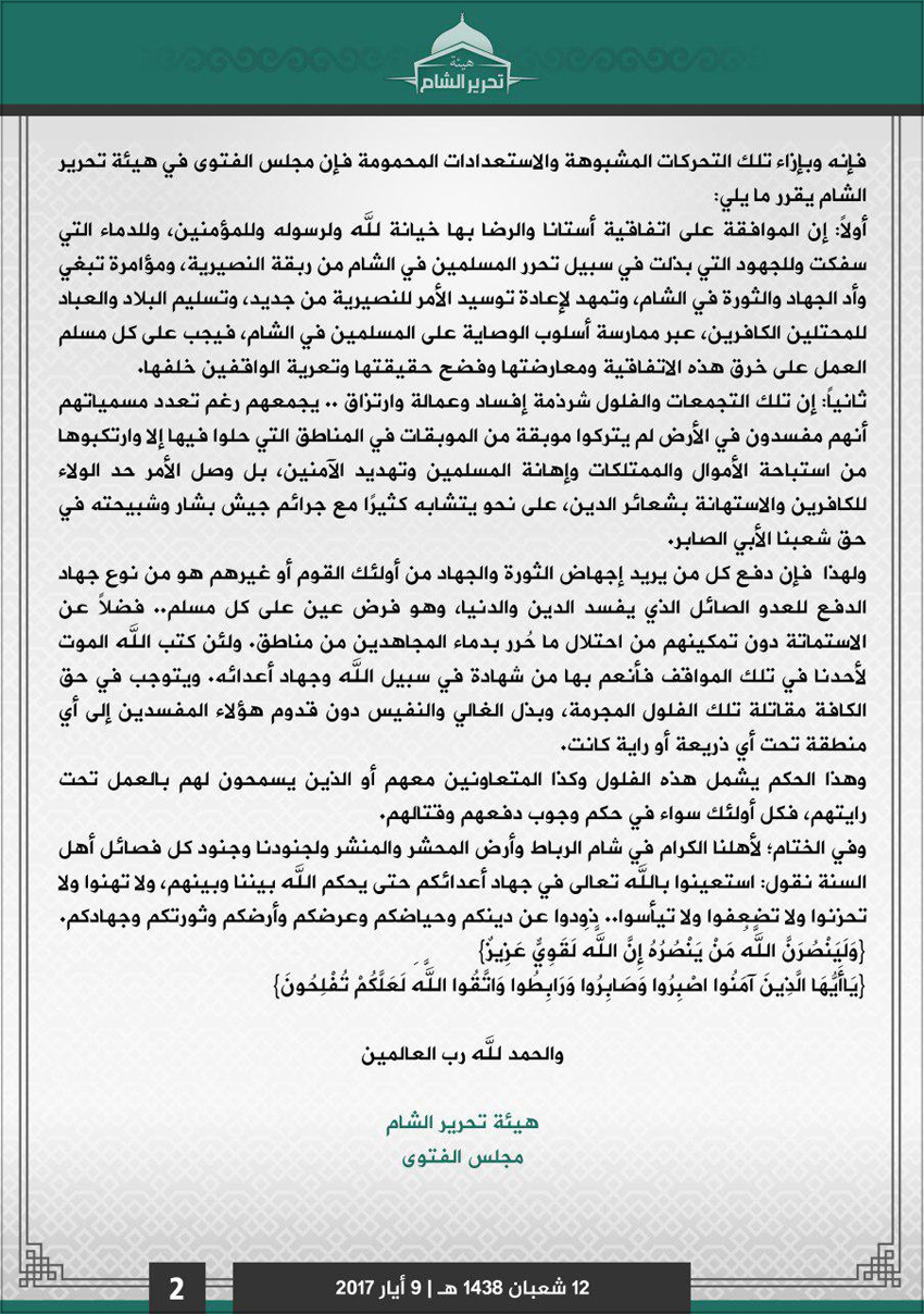ولنستجلي حقيقة الأمر يمكن أن نقف عند بيان أصدره مجلس الفتوى في (هيئة تحرير الشام) بتاريخ 9 أيار 2017، فقد أوضح البيان موقف الهيئة الشرعي من التطورات والمستجدات الأخيرة حيال الثورة السورية، بحسب عنوان البيان.