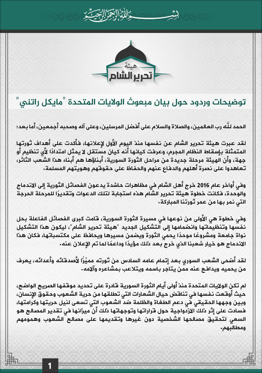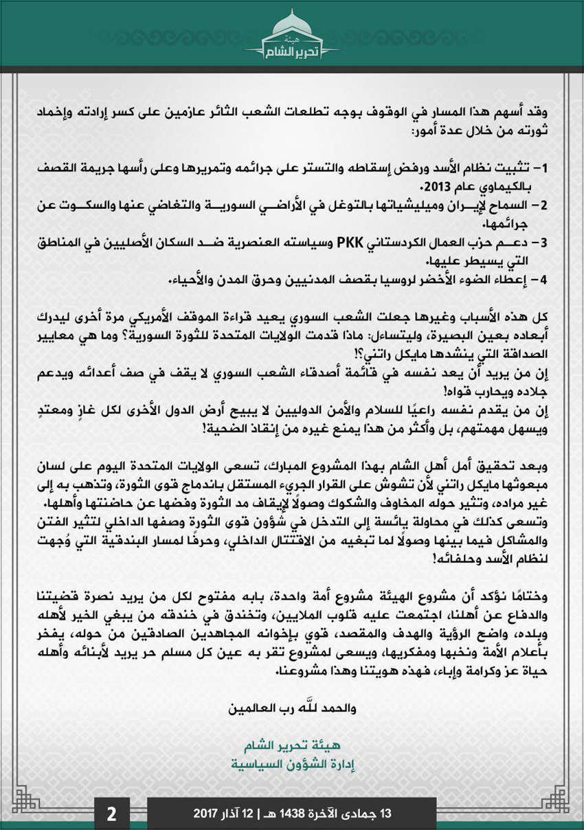 من جهة أخرى تسعى (هيئة تحرير الشام) إلى إقناع دول الجوار والعالم بالتعامل معها كونها الجهة المسيطرة على المنطقة، وقد عُرِفَ عن (القاعدة) عمومًا و(الجولاني) خصوصًا بذلُ أيّ أمر مقابل الحفاظ على وجوده ومنصبه، ويتضح ذلك من خلال ردّ رئيس إدارة الشؤون السياسية في (هيئة تحرير الشام) (زيد العطار) على بيان مبعوث الولايات المتحدة إلى سورية (مايكل راتني)، الذي وصف فيه الهيئة ومن ينضم لها بأنهم جزء من شبكة (القاعدة)، فقد أكد (العطار) أن مشروع الهيئة لا علاقة له بتنظيمات أخرى، ويمثل اندماجًا لقوى الثورة السورية ومرحلة جديدة من مراحلها،