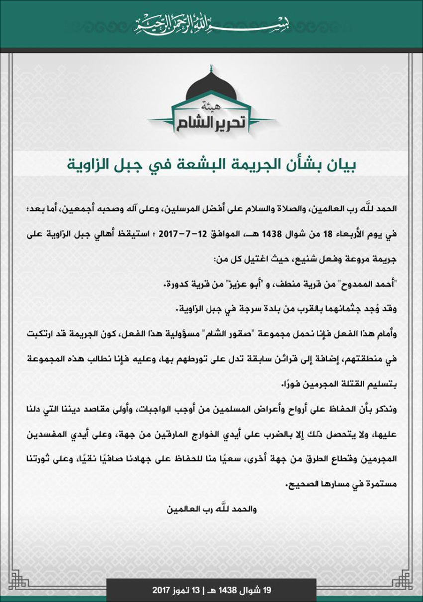 إذ اتهمت فيه ألوية (صقور الشام) باغتيال عنصرين من الهيئة في جبل الزاوية بريف إدلب، معتبرةً أن (صقور الشام) تقف وراء العملية لأن الجريمة ارتكبت في المناطق التي يسيطر عليها (صقور الشام)، استنادًا إلى الادعاء فقط، ومن دون تقديم أدلة طالبت الهيئة ألوية الصقور بتسليم العناصر الذين نفذوا عملية الاغتيال، مؤكدة أن (صقور الشام) أقدمت مرات عدّة على تنفيذ عمليات مشابهة في مناطق عدّة بريف إدلب.