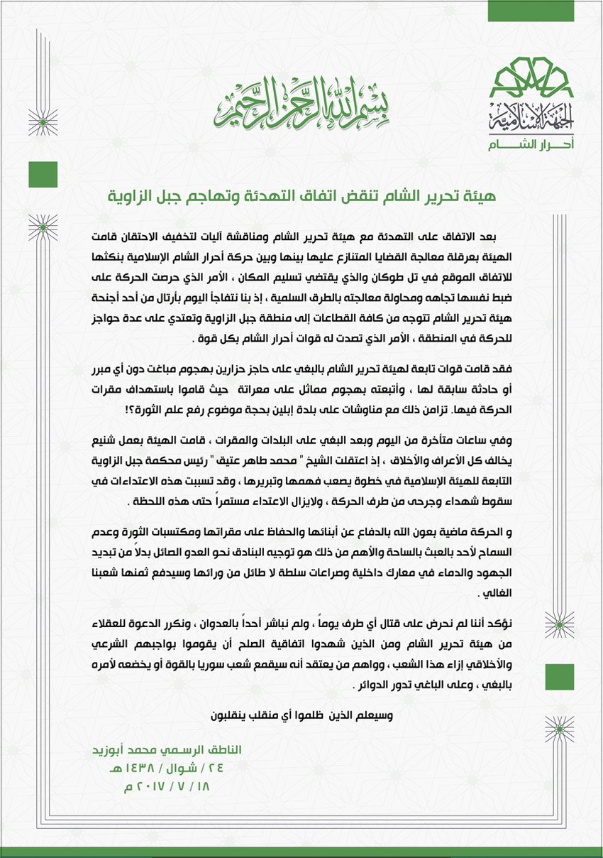 فأصدرت (حركة أحرار الشام) بيانًا بتاريخ الثلاثاء 18-7-2017م وضحّت فيه أن (هيئة تحرير الشام) نكثت اتفاق التهدئة الموقّع في بلدة تل طوقان، وأرسلت أرتالًا عسكرية إلى قطاعات الحركة في جبل الزاوية، وسيطرت على حاجز حزارين، وهاجمت بلدة معراتة، واستهدفت مقرات الحركة هناك، وتزامن ذلك مع مناوشات على بلدة إبين بحجة رفع علم الثورة كما جاء في البيان.