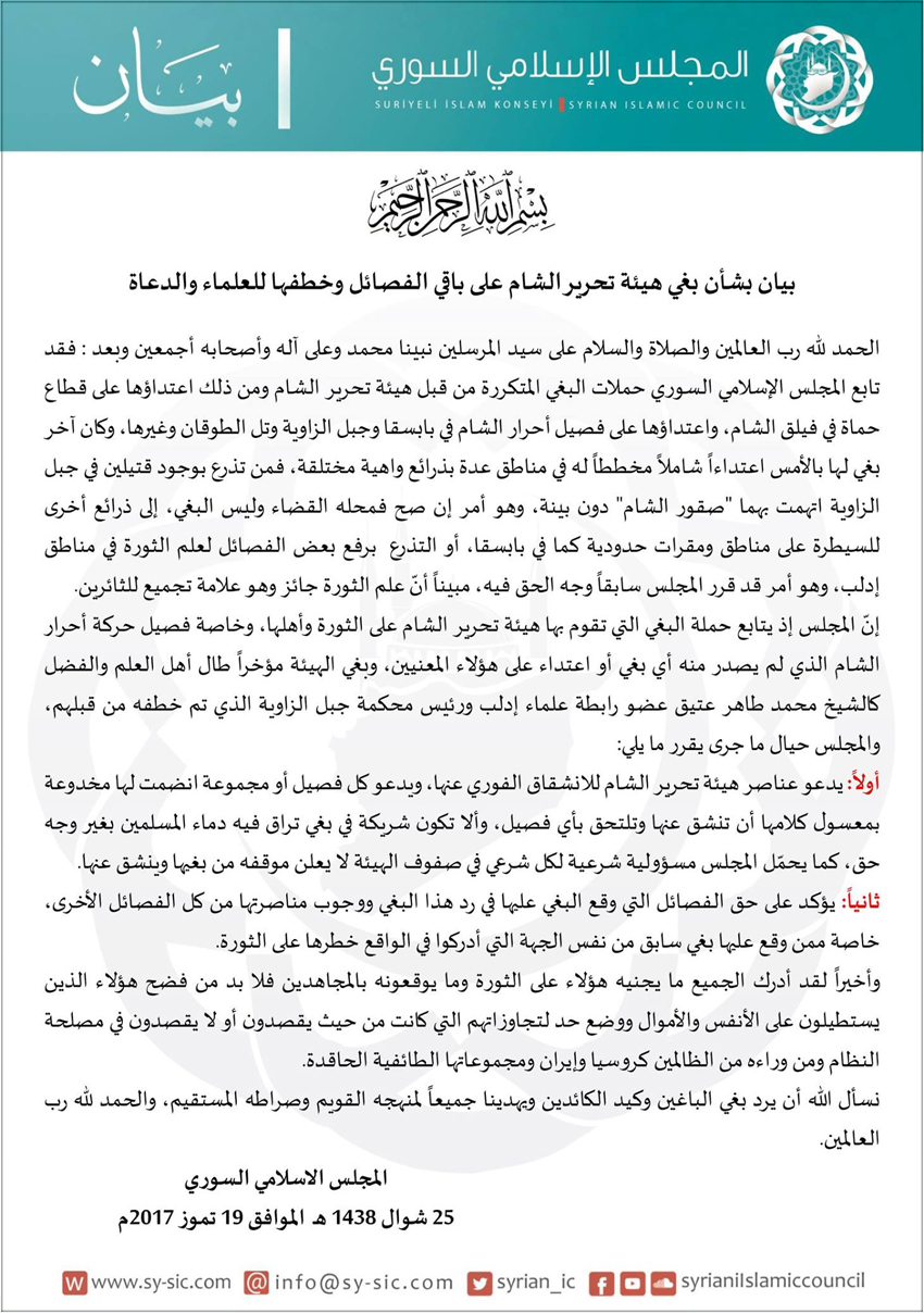 وبعد حملات الاعتداءات المتكررة أصدر المجلس الإسلامي السوري بيانًا يوم الثلاثاء الموافق 19-7-2017م دعا فيه عناصر (هيئة تحرير الشام) والمجموعات التي انضمت لها إلى الانشقاق الفوري عنها، وحمّل المجلس مسؤولية شرعية لكلّ شرعي في صفوف الهيئة لا يعلن موقفه من بغيها وينشق عنها، وأكدّ المجلس على حقّ الفصائل التي وقع البغي عليها في ردّه ووجوب مناصرتها من كلّ الفصائل الأخرى.