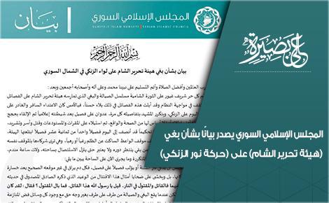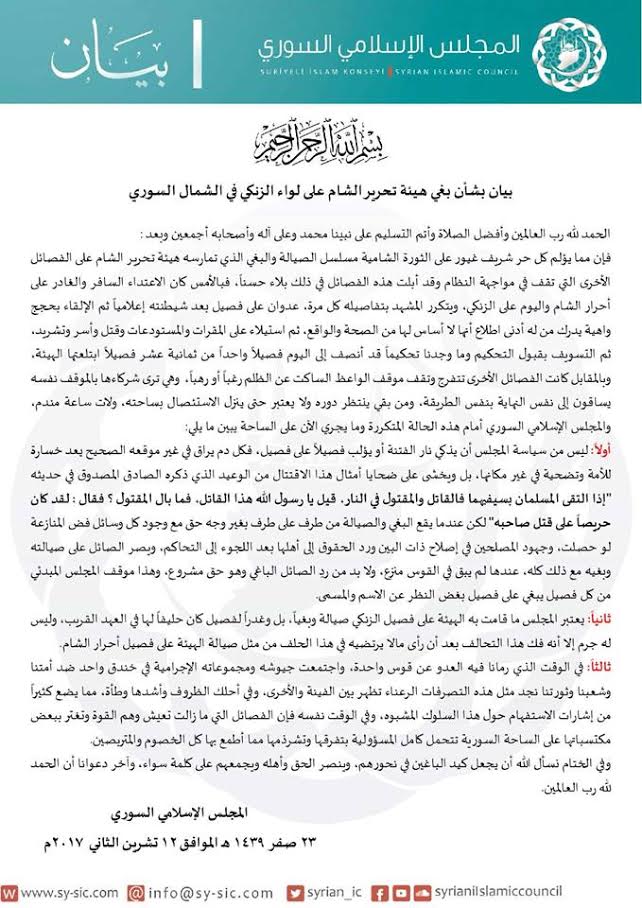 أصدر (المجلس الإسلامي السوري) يوم الأحد 23 صفر 1439ه الموافق 12 تشرين الثاني 2017م، بيانًا أوضح فيه موقفه من الاقتتال الأخير بين (هيئة تحرير الشام) و(حركة نور الدين الزنكي)؛ فقد اعتبر المجلس أن ما قامت به (هيئة تحرير الشام) على (الزنكي) يعّد "صيالةً وبغيًا، بل وغدرًا لفصيل كان حليفًا لها في العهد القريب".