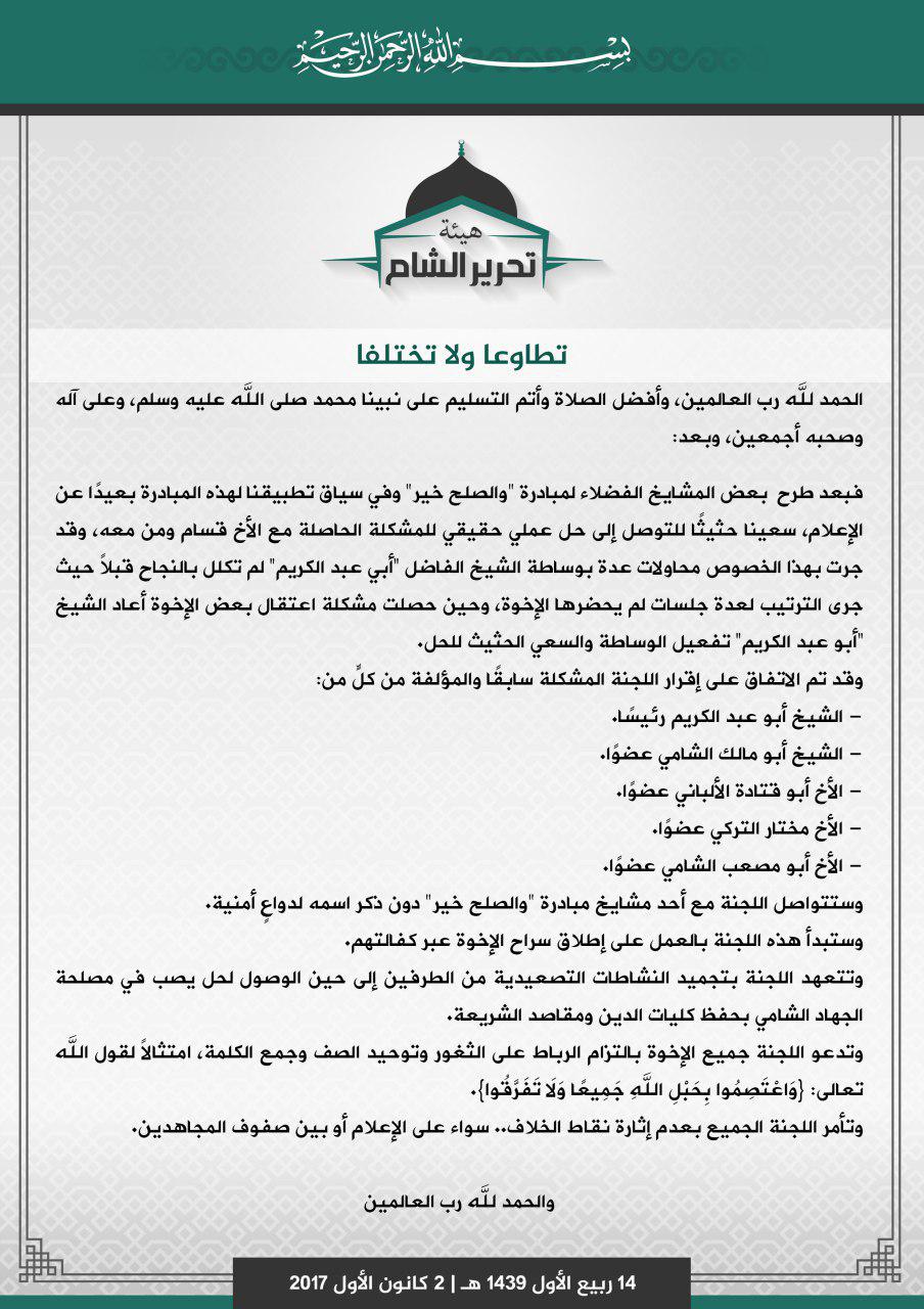 أصدرت "هيئة تحرير الشام" يوم السبت 14 ربيع الأول 1439هـ / 2 كانون الأول 2007م بيانًا بعنوان (تطاوعَا ولا تختلفا) قالت فيه: إنها -بعد طرح بعض المشايخ لمبادرة (الصلح خير)- سعت للتوصل إلى حلّ حقيقي للمشكلة الحاصلة مع "الأخ قسّام" ومن معه، وذلك بوساطة "أبو عبد الكريم الخراساني" إلا أنّ المحاولات لم تكلل بالنجاح بسبب عدم حضور الطرف الثاني.