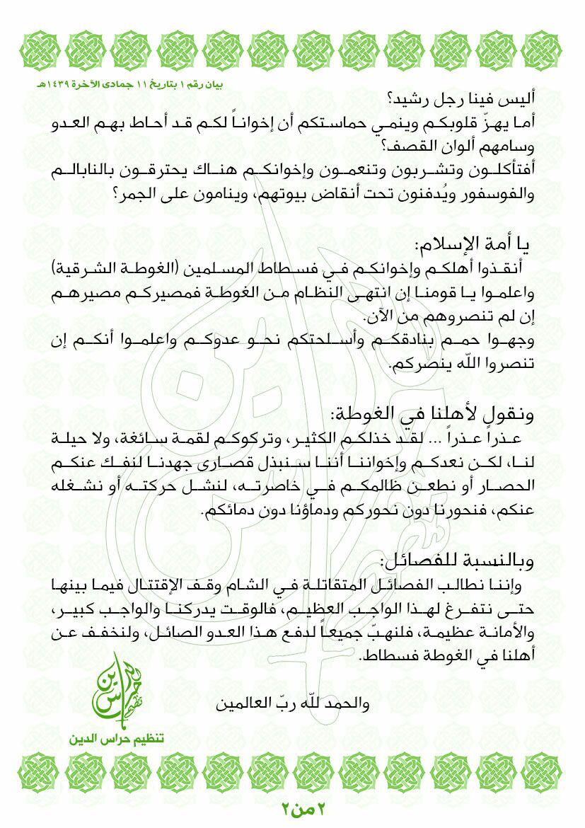 وأصدر (حراس الدين) أوّل بيان له يوم الثلاثاء 11 جمادى الآخرة 1439 الموافق 27 شباط 2018، حمل عنوان: (أنقذوا فسطاط المسلمين)، دعا فيه التنظيم إلى إنقاذ المسلمين في الغوطة الشرقية، ومما جاء في البيان: "يا أمّة الإسلام، أنقذوا أهلكم وإخوانكم في فسطاط المسلمين (الغوطة الشرقية) واعلموا يا قومنا إن انتهى النظام من الغوطة فمصيركم مصيرهم إن لم تنصروهم من الآن، وجّهوا حمم بنادقكم وأسلحتكم نحو عدوكم...".