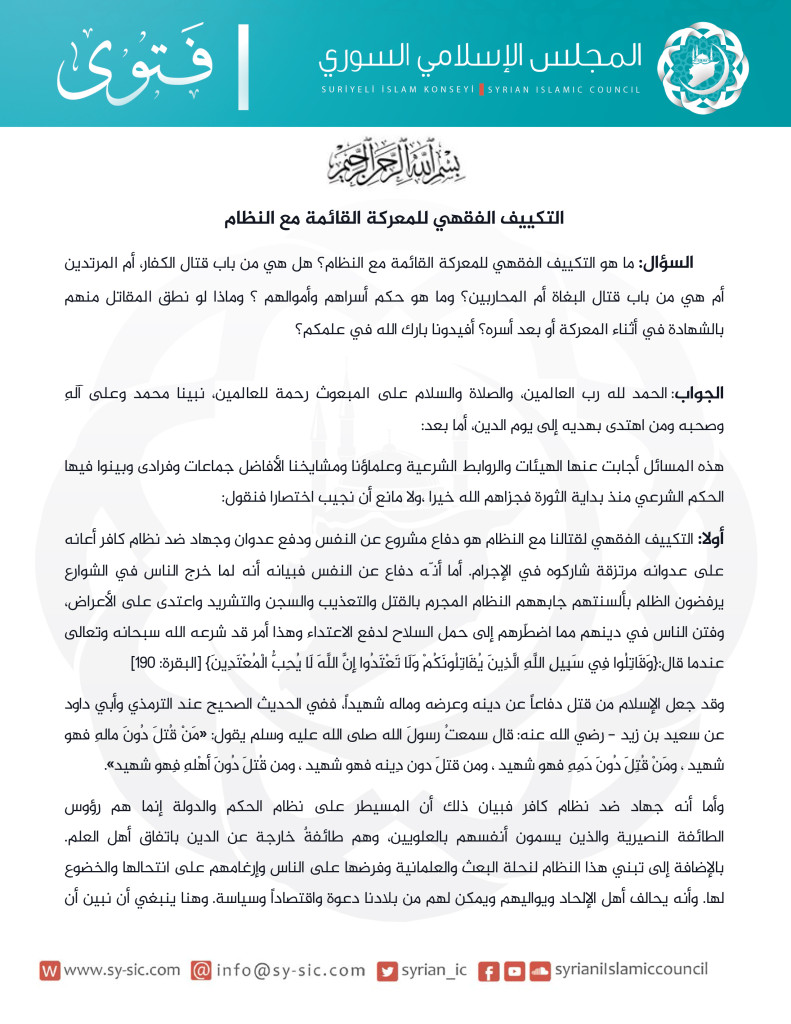 أولا: التكييف الفقهي لقتالنا مع النظام هو دفاع مشروع عن النفس ودفع عدوان وجهاد ضد نظام كافر أعانه على عدوانه مرتزقة شاركوه في الإجرام. أما أنّه دفاع عن النفس فبيانه أنه لما خرج الناس في الشوارع يرفضون الظلم بألسنتهم جابههم النظام المجرم بالقتل والتعذيب والسجن والتشريد واعتدى على الأعراض، وفتن الناس في دينهم مما اضطّرهم إلى حمل السلاح لدفع الاعتداء وهذا أمر قد شرعه الله سبحانه وتعالى عندما قال: {وَقَاتِلُوا فِي سَبِيلِ اللَّهِ الَّذِينَ يُقَاتِلُونَكُمْ وَلَا تَعْتَدُوا إِنَّ اللَّهَ لَا يُحِبُّ الْمُعْتَدِينَ} [البقرة: 190]