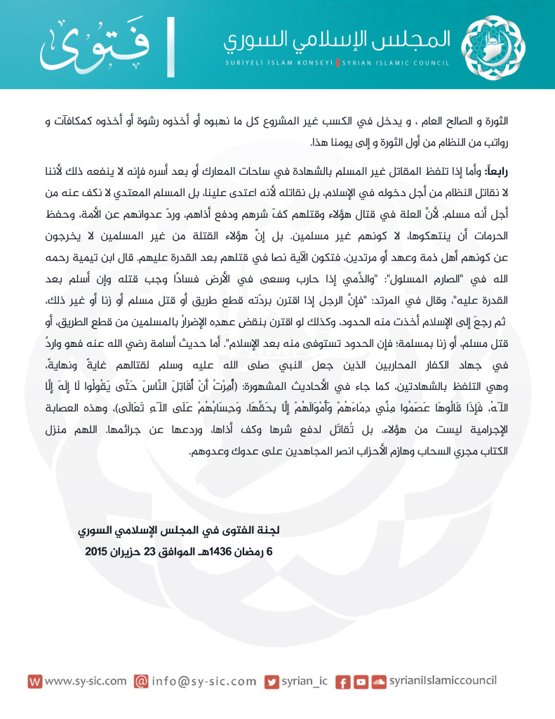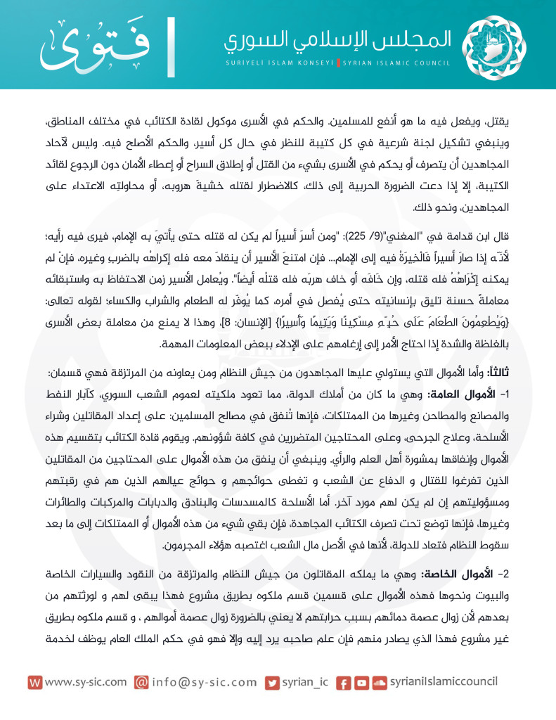 1. الأموال العامة: وهي ما كان من أملاك الدولة، مما تعود ملكيته لعموم الشعب السوري، كآبار النفط والمصانع والمطاحن وغيرها من الممتلكات، فإنها تُنفق في مصالح المسلمين: على إعداد المقاتلين وشراء الأسلحة، وعلاج الجرحى، وعلى المحتاجين المتضررين في كافة شؤونهم. ويقوم قادة الكتائب بتقسيم هذه الأموال وإنفاقها بمشورة أهل العلم والرأي. وينبغي أن ينفق من هذه الأموال على المحتاجين من المقاتلين الذين تفرغوا للقتال و الدفاع عن الشعب و تغطى حوائجهم و حوائج عيالهم الذين هم في رقبتهم ومسؤوليتهم إن لم يكن لهم مورد آخر. أما الأسلحة كالمسدسات والبنادق والدبابات والمركبات والطائرات وغيرها، فإنها توضع تحت تصرف الكتائب المجاهدة، فإن بقي شيء من هذه الأموال أو الممتلكات إلى ما بعد سقوط النظام فتعاد للدولة، لأنها في الأصل مال الشعب اغتصبه هؤلاء المجرمون.