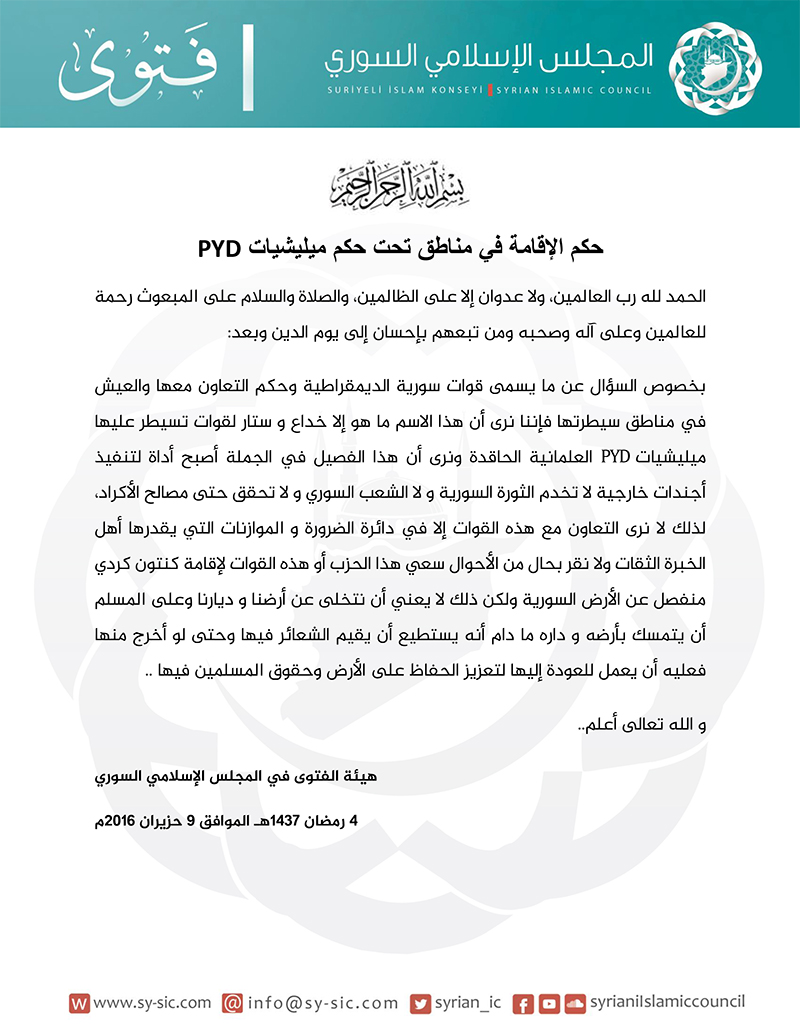 بخصوص السؤال عن ما يسمى قوات سورية الديمقراطية وحكم التعاون معها والعيش في مناطق سيطرتها فإننا نرى أن هذا الاسم ما هو إلا خداع و ستار لقوات تسيطر عليها ميليشيات PYD العلمانية الحاقدة ونرى أن هذا الفصيل في الجملة أصبح أداة لتنفيذ أجندات خارجية لا تخدم الثورة السورية ولا الشعب السوري ولا تحقق حتى مصالح الأكراد، لذلك لا نرى التعاون مع هذه القوات إلا في دائرة الضرورة والموازنات التي يقدرها أهل الخبرة الثقات ولا نقر بحال من الأحوال سعي هذا الحزب أو هذه القوات لإقامة كنتون كردي منفصل عن الأرض السورية ولكن ذلك لا يعني أن نتخلى عن أرضنا و ديارنا وعلى المسلم أن يتمسك بأرضه و داره ما دام أنه يستطيع أن يقيم الشعائر فيها وحتى لو أخرج منها فعليه أن يعمل للعودة إليها لتعزيز الحفاظ على الأرض وحقوق المسلمين فيها ..