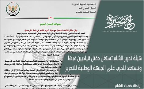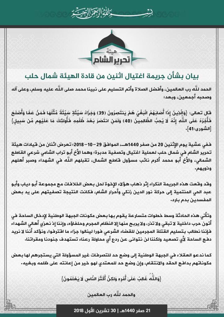 ووصفت هيئة تحرير الشام في بيان لها يوم الثلاثاء 30-10-2018م حادثةَ مقتل القياديين (أبو تراب الشامي وأبو محمد أكرم) بأنّها "عملية اغتيال وتصفية مدبّرة"، واتهمت بعض مكوّنات الجبهة الوطنية للتحرير "بإدخال الساحة في أتون حرب داخلية لا تبقي ولا تذر"، كما طالب البيان بتسليم من سمّاهم "القتلة المجرمين" للقضاء الشرعي.