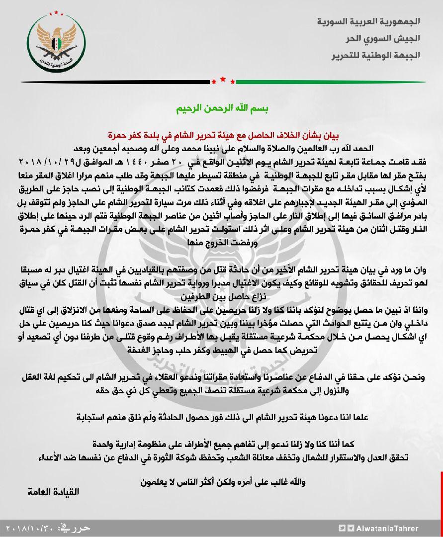 وأضاف البيان: "في أثناء ذلك مرّت سيارة لتحرير الشام على الحاجز ولم تتوقف، بل بادر مرافق السائق فيها إلى إطلاق النار على الحاجز وأصاب اثنين من عناصر الجبهة الوطنية، فتمّ الرد حينها على إطلاق النار، فقُتل اثنان من هيئة تحرير الشام، وعلى إثر ذلك استولت تحرير الشام على بعض مقرّات الجبهة في كفر حمرة، ورفضت الخروج منها".