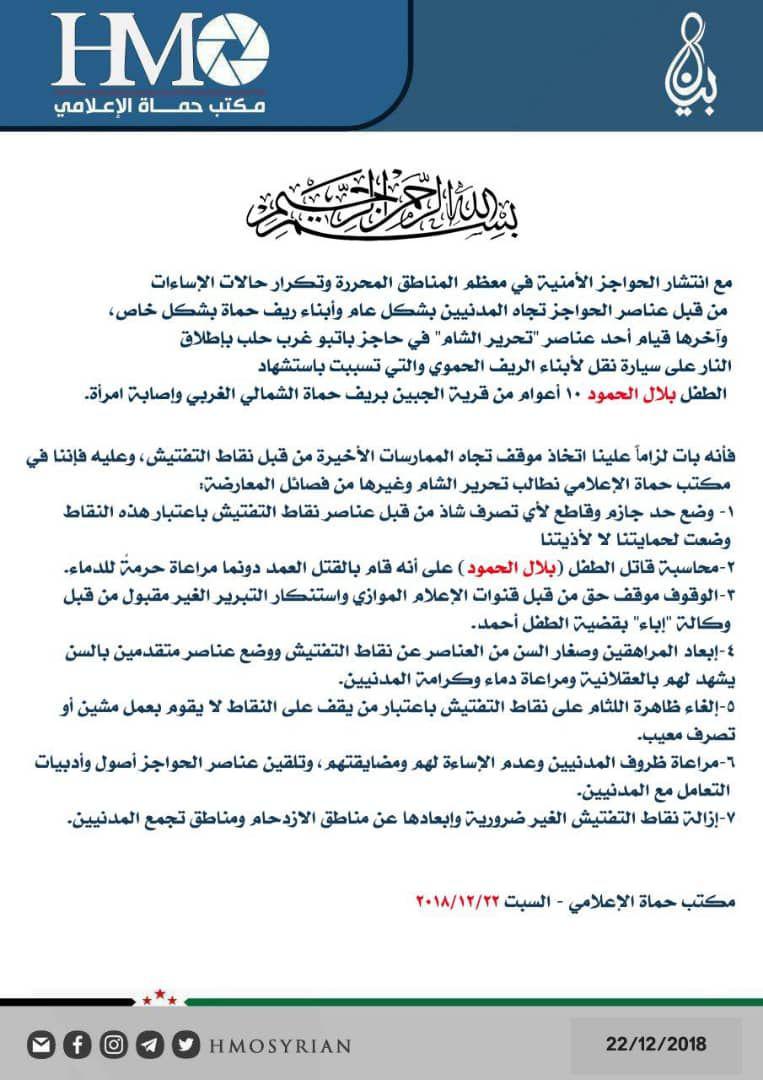 فقد ارتكبت إحدى هذه الحواجز جريمة بشعة صباح يوم السبت 22 كانون الأول، إذ قام عناصر تابعون لهيئة (تحرير الشام) بإطلاق النار على حافلة ركاب مدنية تُقلّ نازحين من أهالي شمالي حماة، كانوا قادمين من مخيم أطمة إلى مدينة اللطامنة، ما أدى إلى مقتل الطفل (بلال حمود الحمود) وإصابة امرأة بجروح خطيرة.
