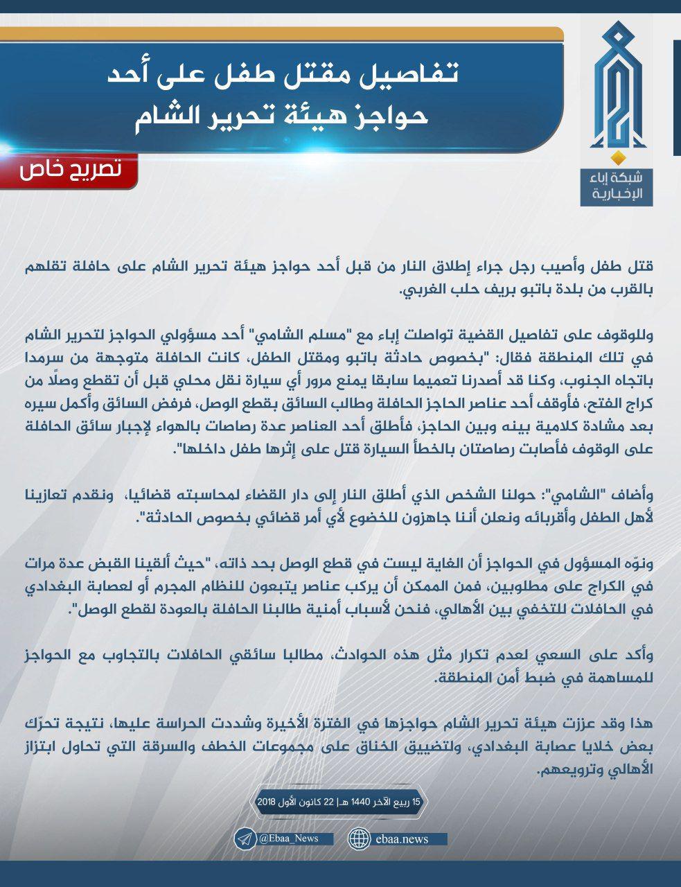 على خلفية الحادثة نشرت شبكة إباء الإخبارية التابعة لـ (هيئة تحرير الشام) تصريحًا خاصًّا استضافت فيه (مسلم الشامي) أحد مسؤولي الحواجز، الذ قال في معرض روايته: "أوقف أحد عناصر الحاجز الحافلةَ، وطالب السائق بقطع الوصل، فرفض السائق وأكمل سيره بعد مشادّة كلامية بينه وبين الحاجز، فأطلق أحد العناصر عدة رصاصات بالهواء لإجبار سائق الحافلة على الوقوف، فأصابت رصاصتان بالخطأ السيارة، قُتِل على إثرها طفل داخلها".